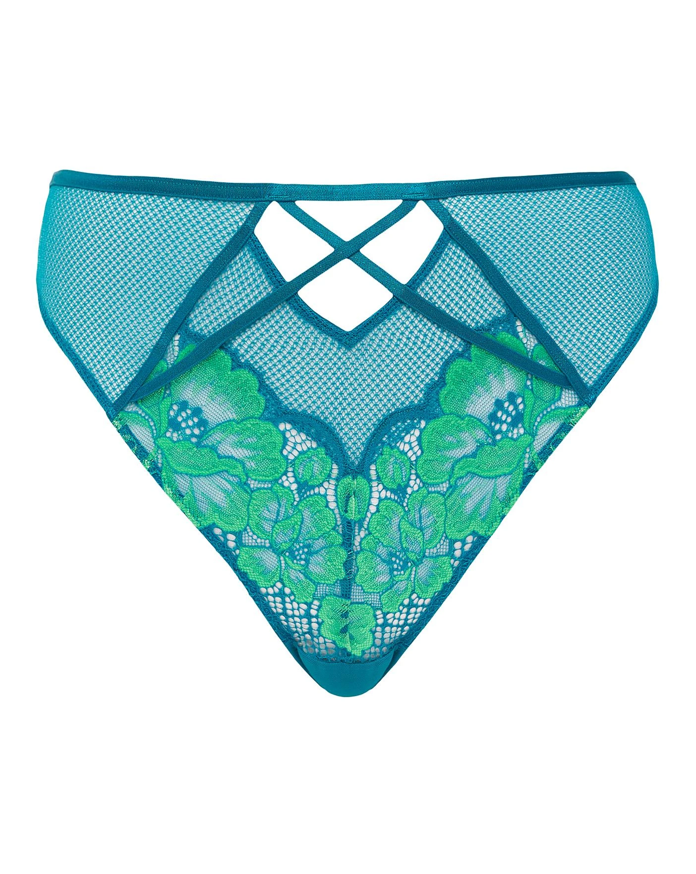 High waist, high leg brazillian brief. Teal blue base with contrast green lace detailling, cut out finish and strap detailling at the front waist. Plain stretch mesh back.