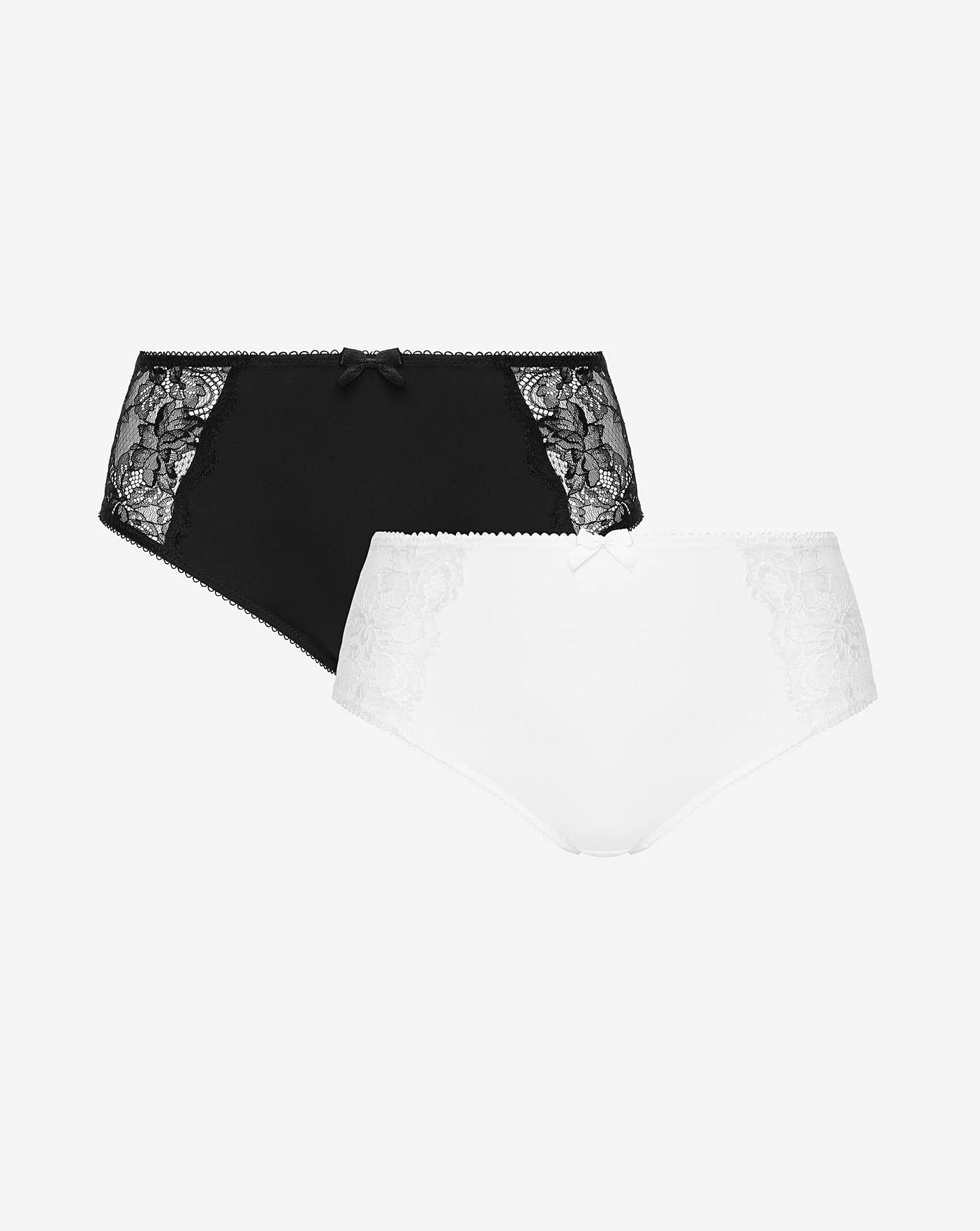 Designed from our bestselling Ella range, the Pretty Secrets 2 pack lace briefs offer the perfect blend of both style and functionality. It is a beautiful staple brief for your everyday wardrobe. These briefs offer good coverage and a high waist to better support and comfort you throughout the day. It features a delicate luxury lace side trim and a gorgeous centre front bow. This style comes in sizes 12 to 34. Take a look at our matching Ella bras available to create the perfect set.
