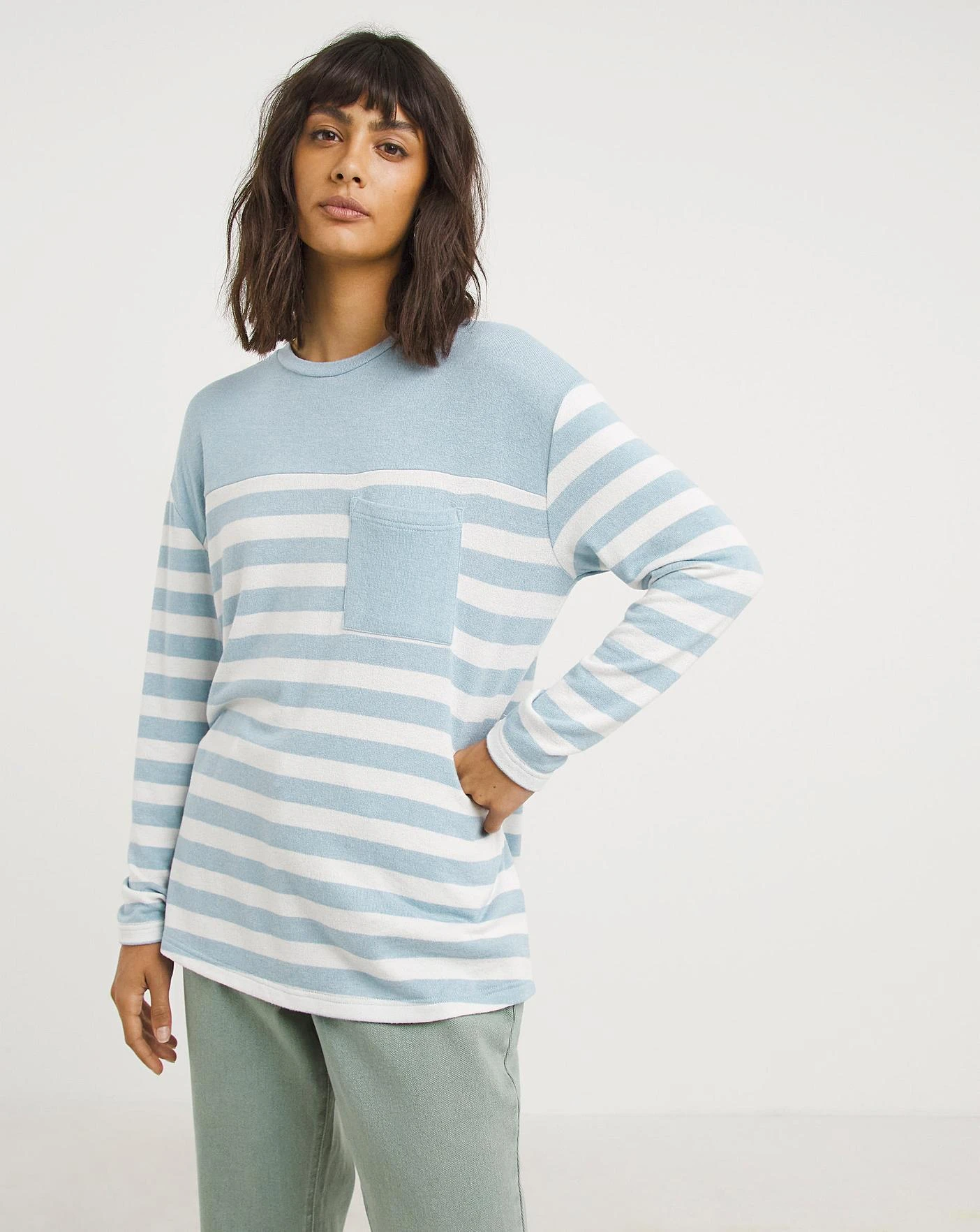 In our popular soft touch material, our long sleeve striped top is the perfect new addition to your leisurewear collection. Pair with joggers or jeans for a comfortable look that doesn’t compromise on style!