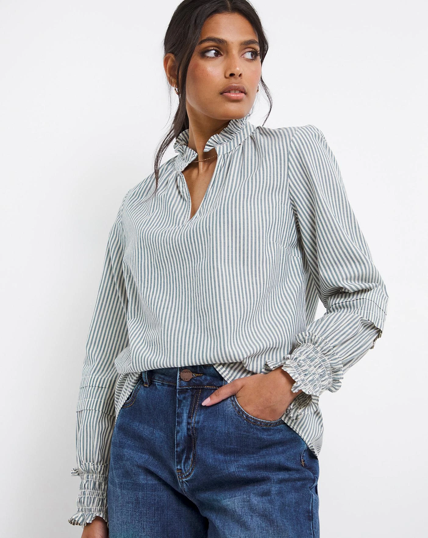 Our stripe pleat sleeve blouse offers the perfect day time look for various occasions. With its pleated sleeve detailing, this shirt can be paired easily with jeans. Made of a non-stretch fabric, this top comes in a relaxed fit so that you can stick to your usual size.