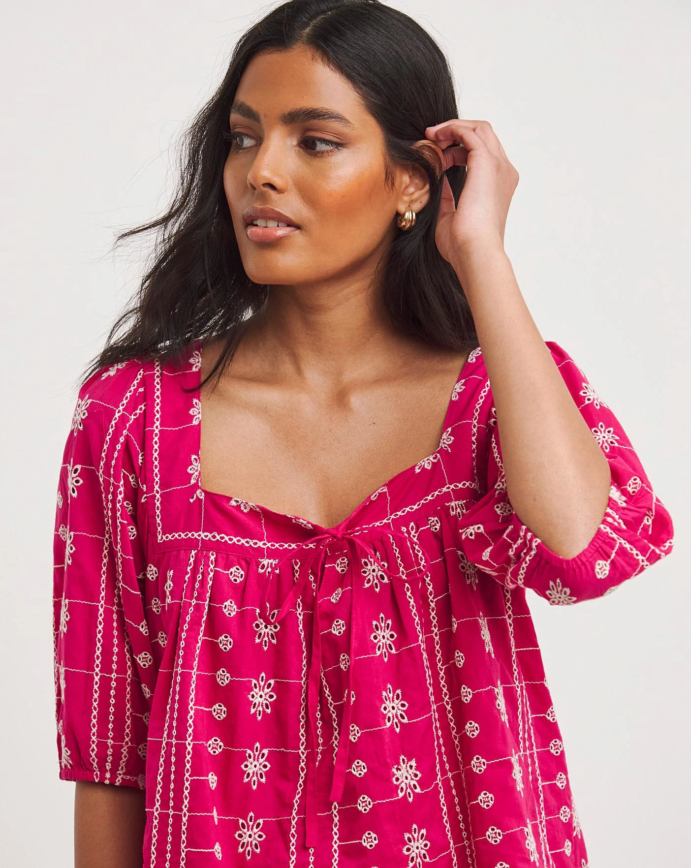 This pretty broderie top is perfect for the sunshine. Featuring a square neckline, short voluminous sleeves and contrast broderie stitching.