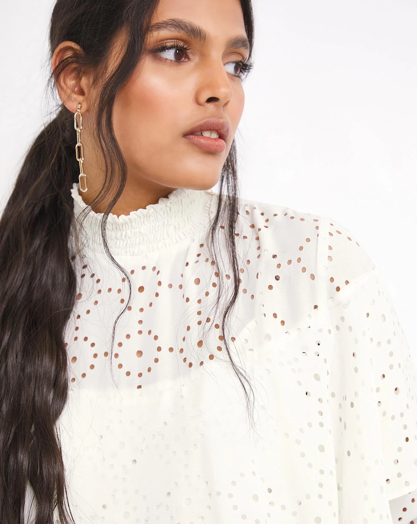 Exclusive to us – Jo by Joanna Hope. This unique foil cutwork blouse features a flattering ruffle yoke and smocked neckline and arm cuffs. Comes with matching cami and fastens with a back button with keyhole detail. Pair with our PU, or leather trousers for the perfect going out look.