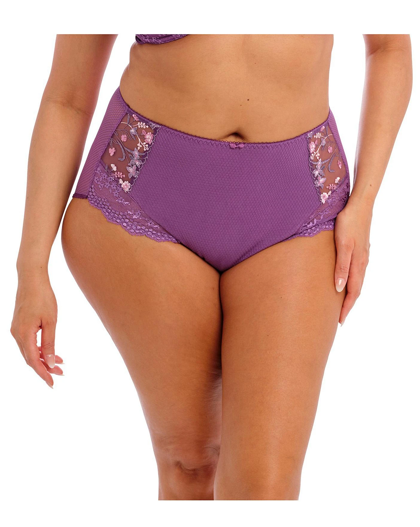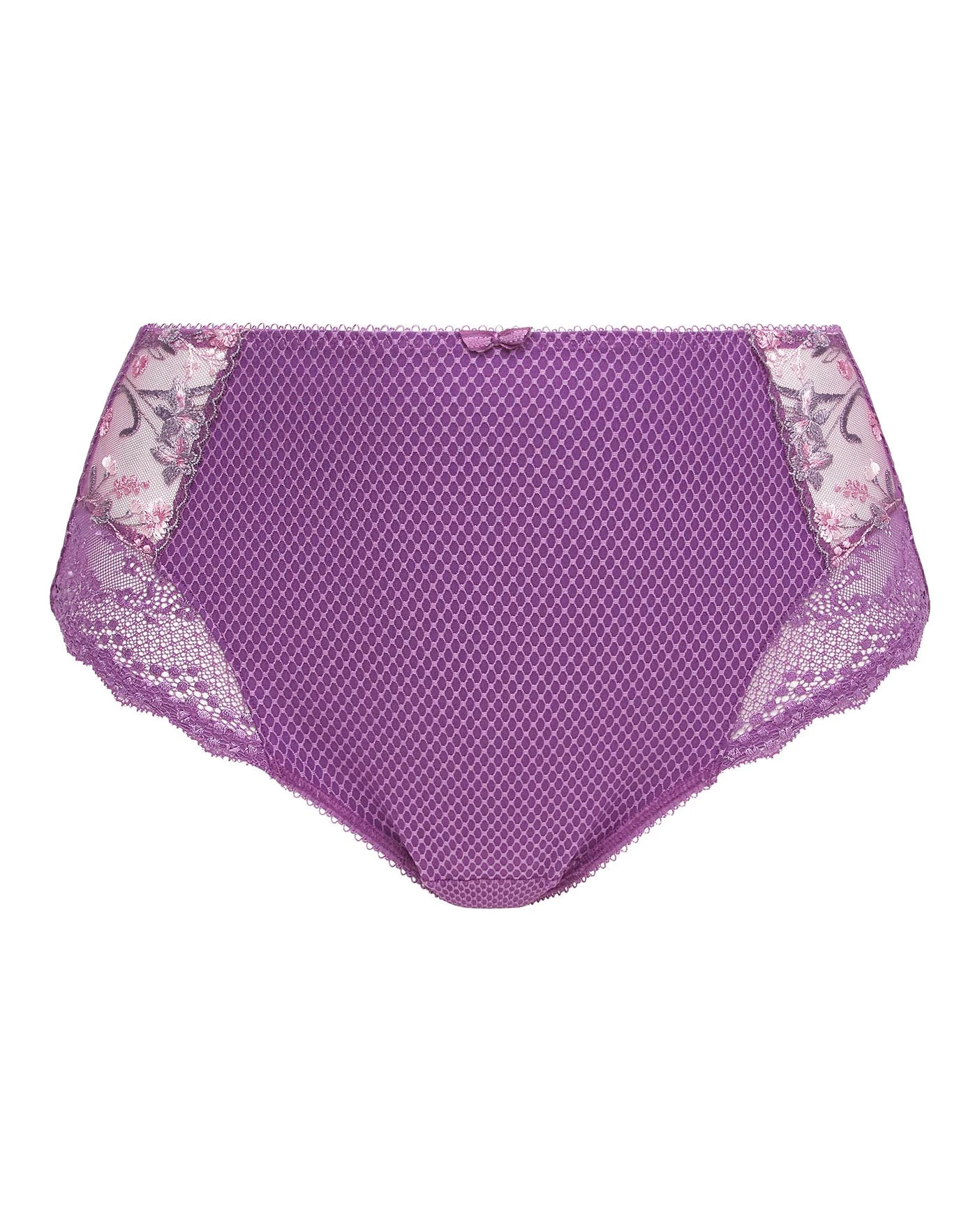 Fuller coverage brief which includes cotton lined diamond mesh front with embroidery side panels and diamond stretch mesh leg panels. Back cut from diamond mesh fabric. Bow detail at centre front.