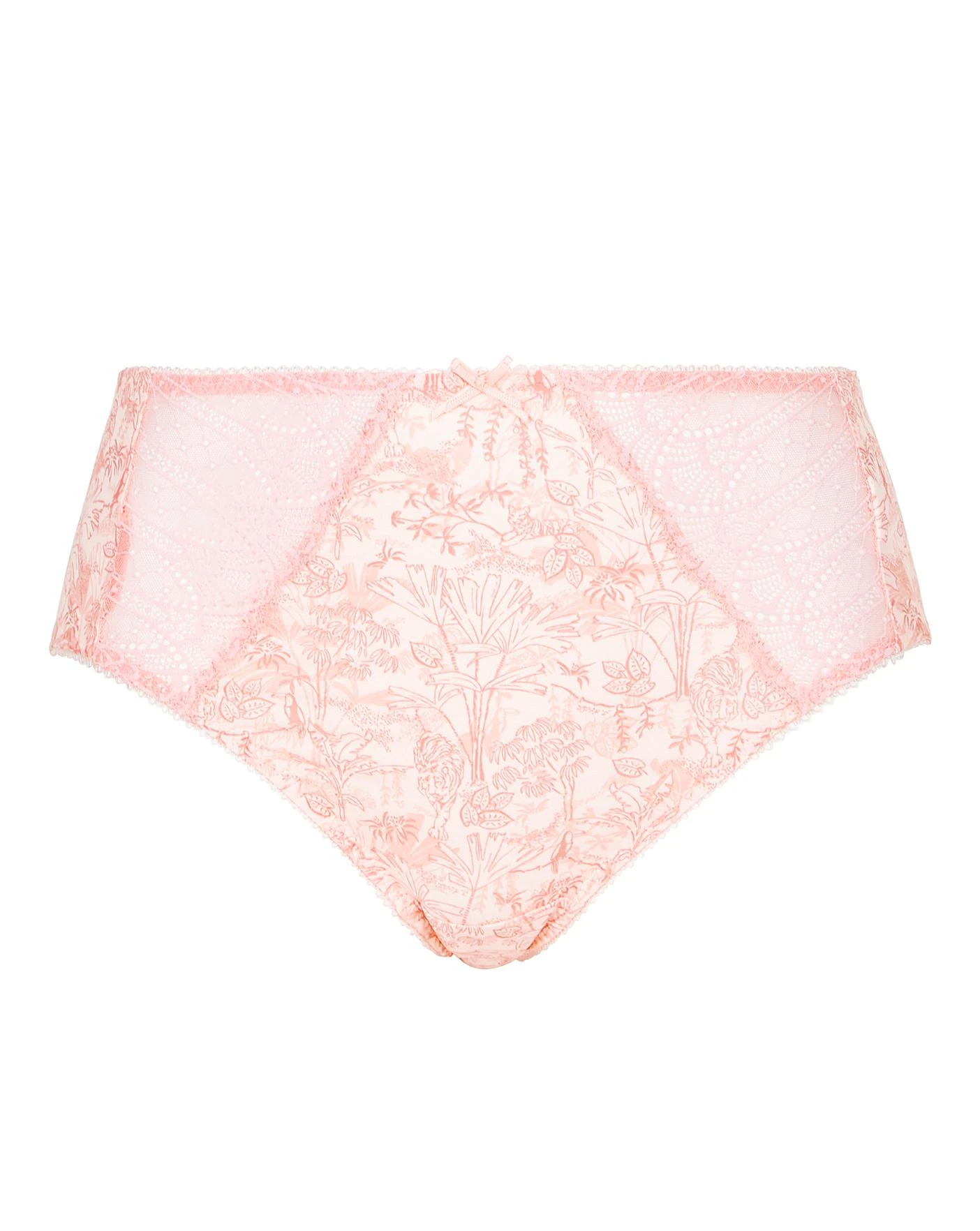 The Mariella illustrative print tells a tropical tale with jungle leaves, toucans and tigers, hidden amongst it all. Stretch lace accents and pretty bow details featured in this style. Fuller coverage brief shape with fully printed matt stretch fabric and stretch lace panels at side front with bow detail at centre front.
