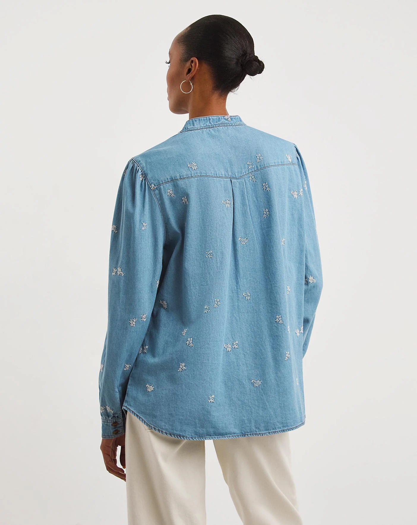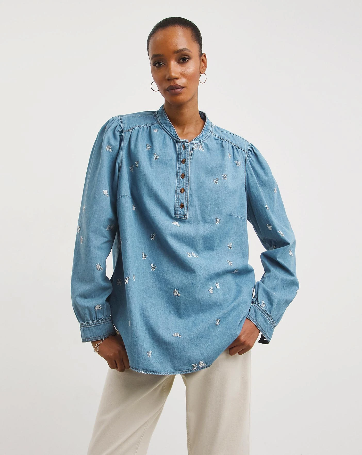 A must have staple in your wardrobe! Our western denim shirt has been updated for the season with a gorgeous floral embroidery. It features two front pockets, a button up front and made from a comfortable lyocell fabric. Dare to wear double denim with your favourite pair of black jeans or wear unbuttoned over a plain white tee for the perfect casual daytime look.