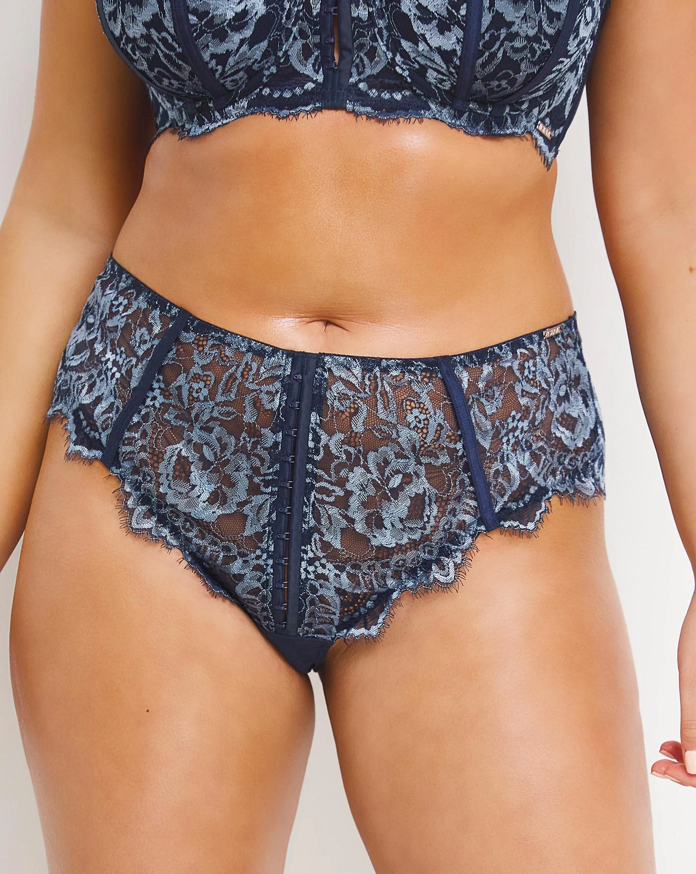 Botanical florals have bloomed with the new collection from Figleaves Curve. The brazilian briefs feature delicate all over delicate lace with panel detailing and hook and eye fashion detailing to front. Midi brazilian legline & cut out rose gold ring detailing to back. Pair with the matching bra for maximum impact.