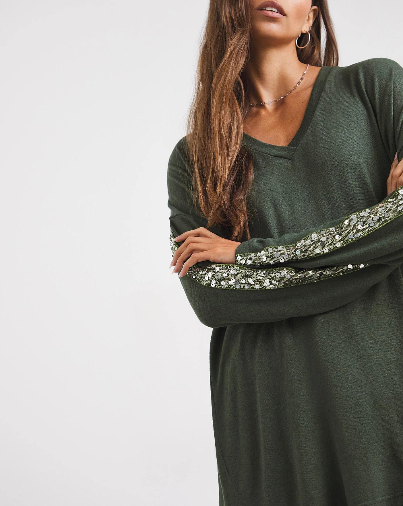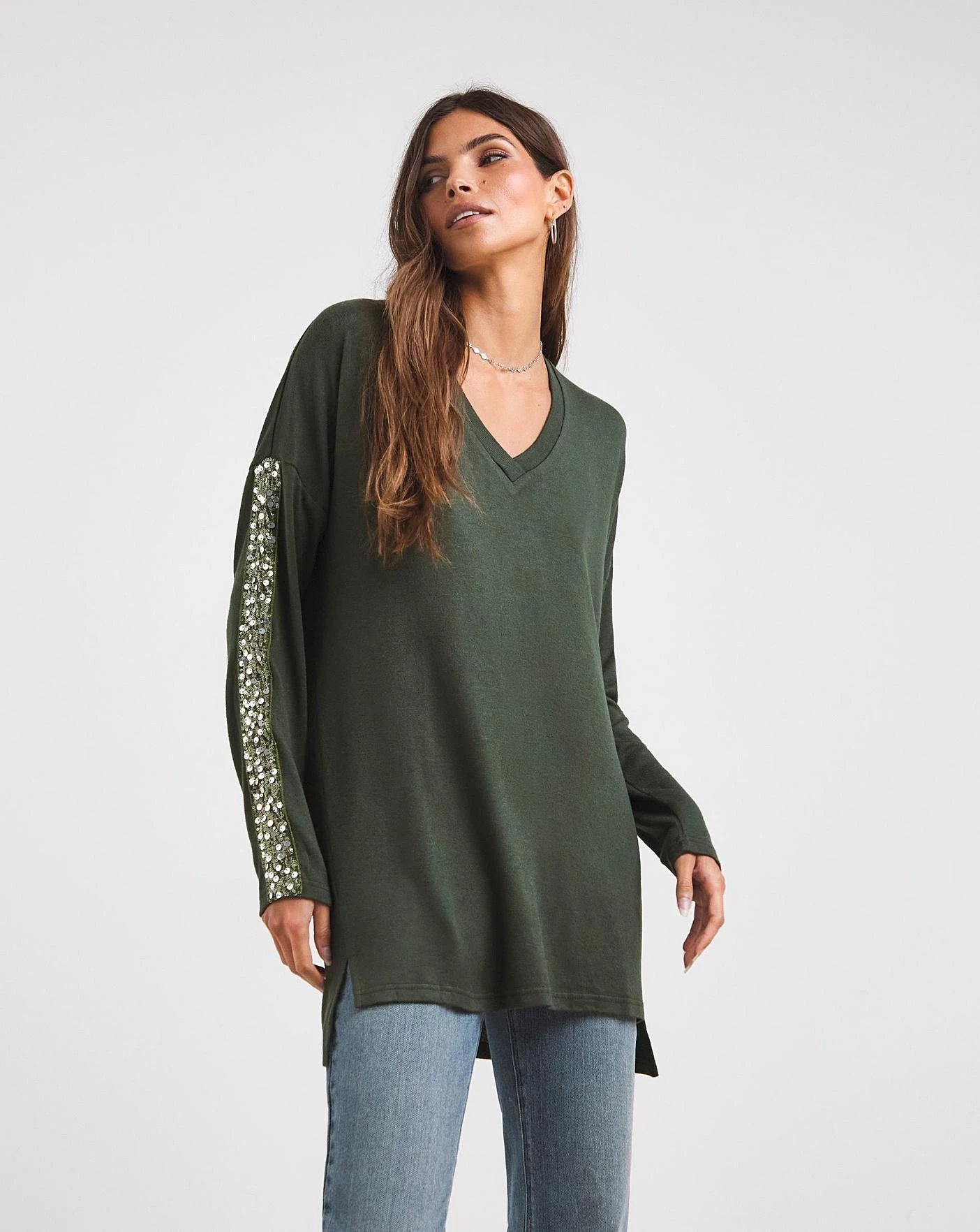 The perfect transitional piece for the season is here! This sequin detail tunic is so versatile it can be worn both up and down. In a super soft jersey fabric and relaxed fit, this tunic will be super comfortable as well as stylish. The sequin sleeve detailing adds a touch of glamour and sparkle to your everyday outift. Wear this tunic with your favourite jeans and jacket for an effortlessly chic daytime look.