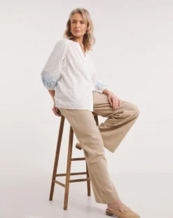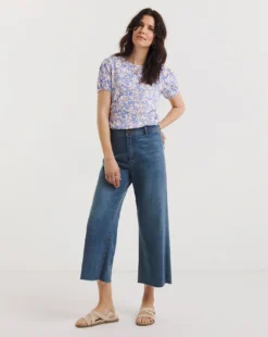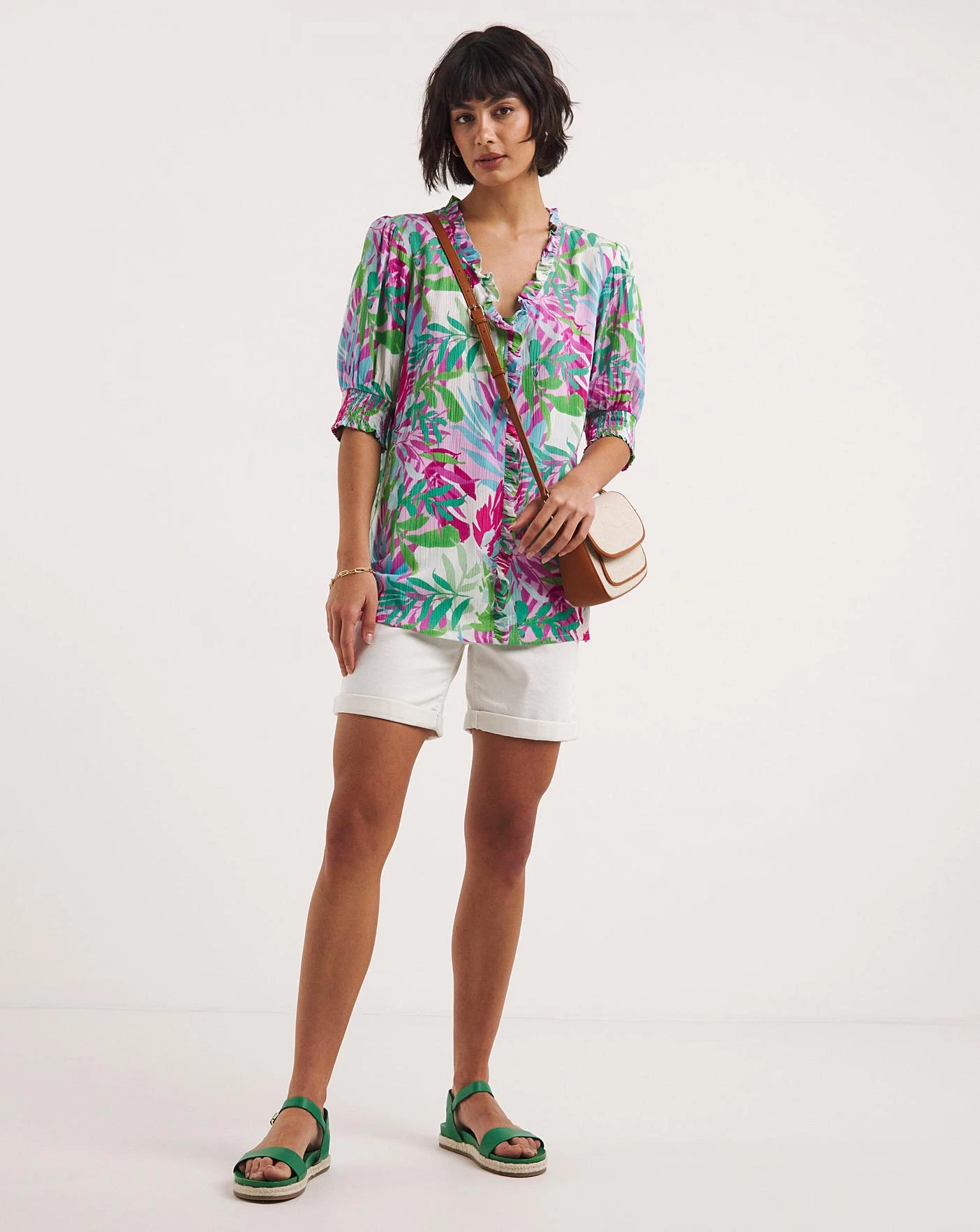 Featuring a v neckline and cuffed sleeves, our crinkle frill trim top can be paired easily with jeans or shorts.