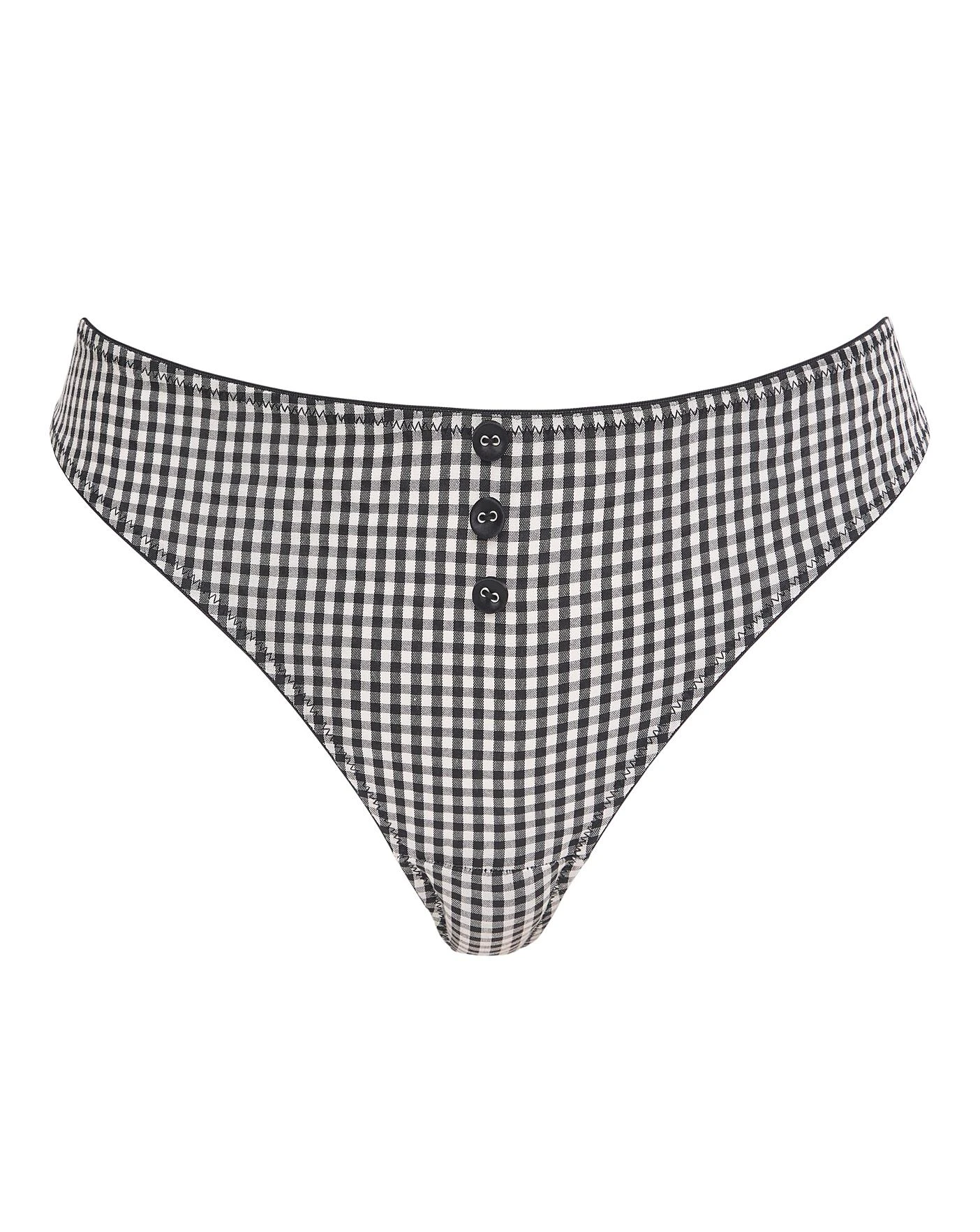 Update your lingerie wardrobe with the gingham thong which is designed with both functionality and style in mind. The thong is constructed to a smooth shape to ensure that it sits comfortably under clothing. It has three buttons detailing and gingham print. Pair with the matching gingham bra to create the perfect look.