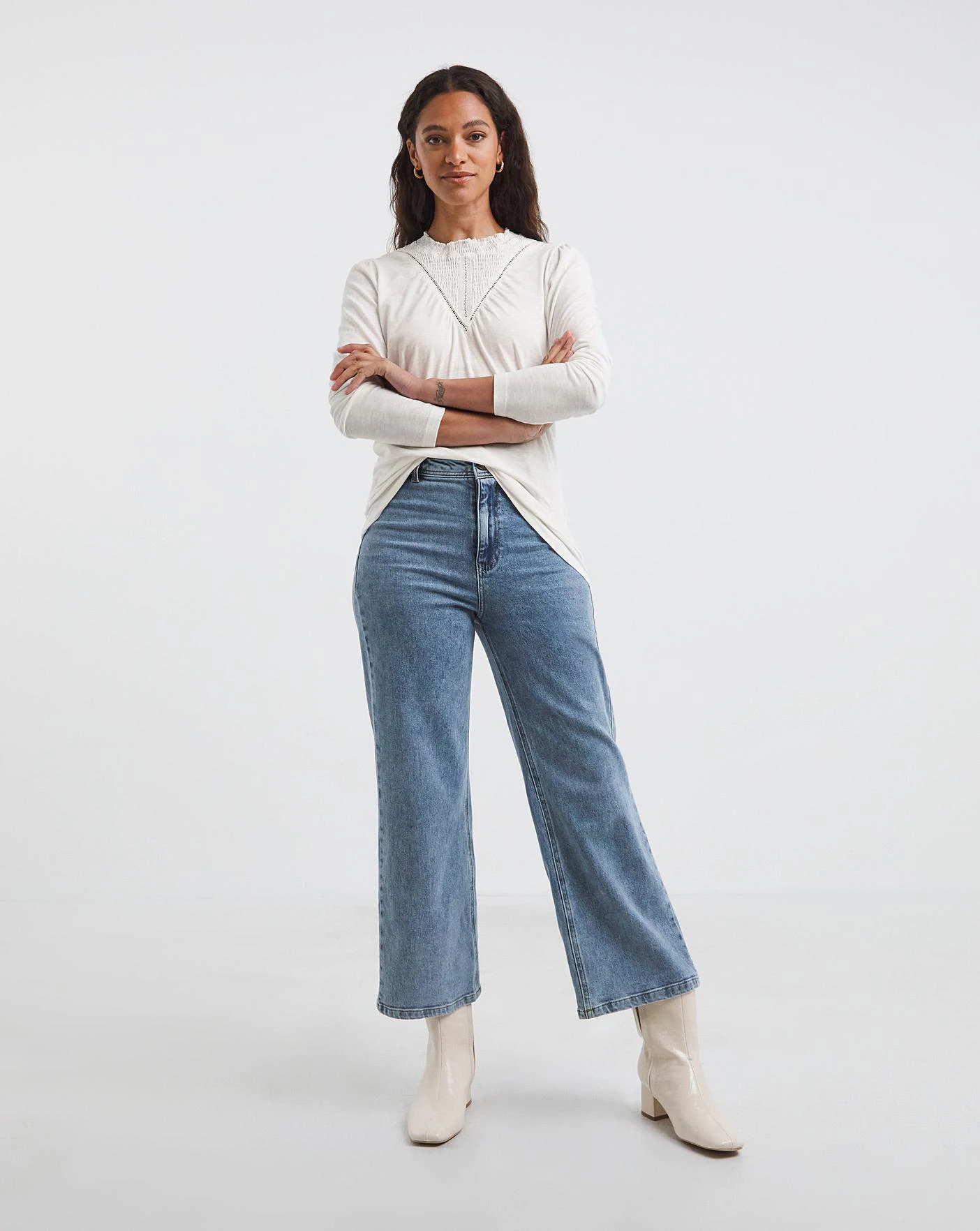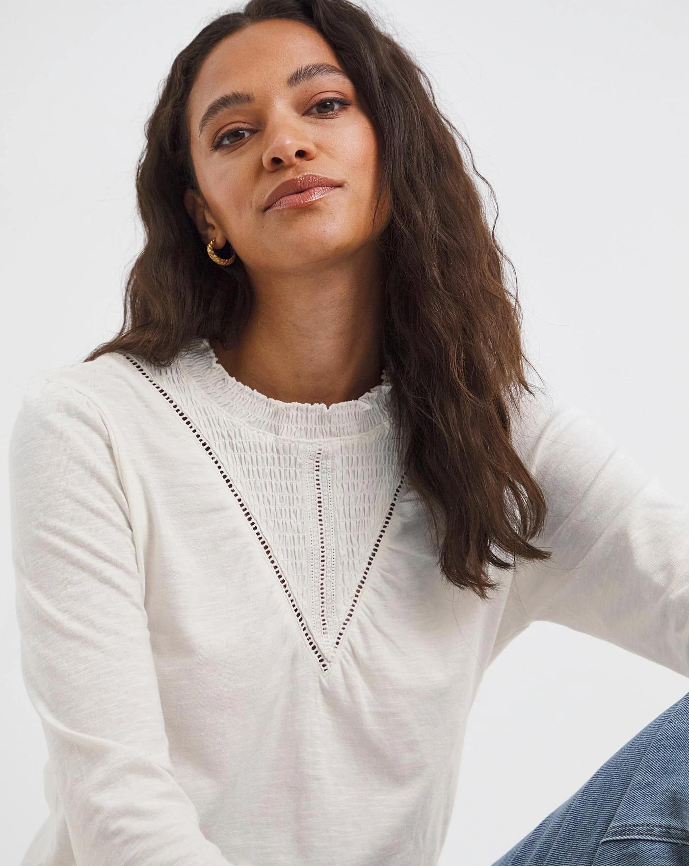 Feel fresh in our shirred yoke insert top! This top features flattering detail across the yoke, and a ruffle high neck which is subtle yet stylish. In a relaxed fit, complete the look with your favourite pair of jeans.