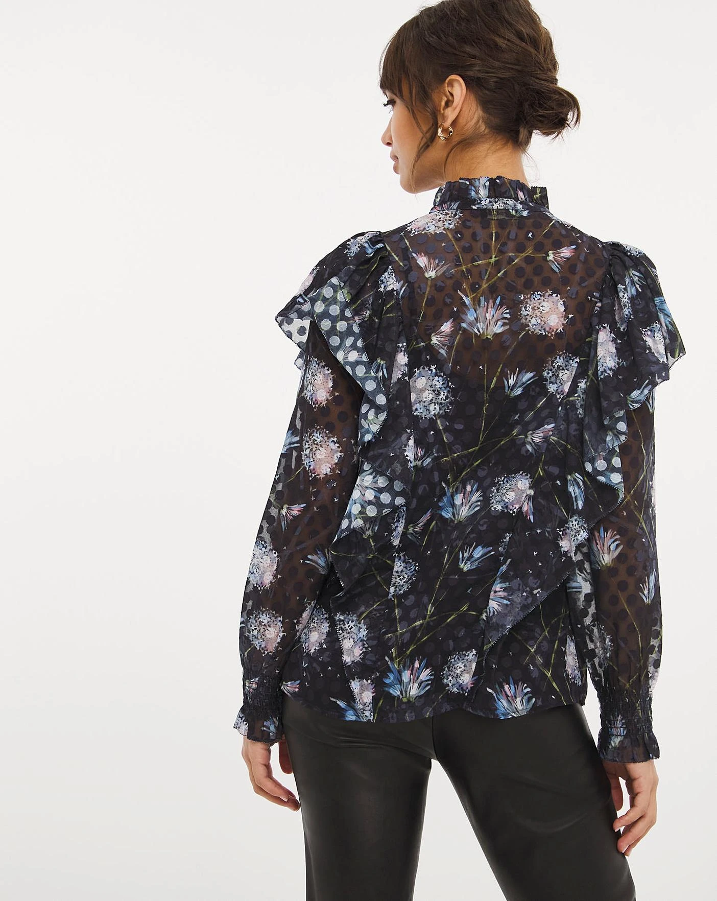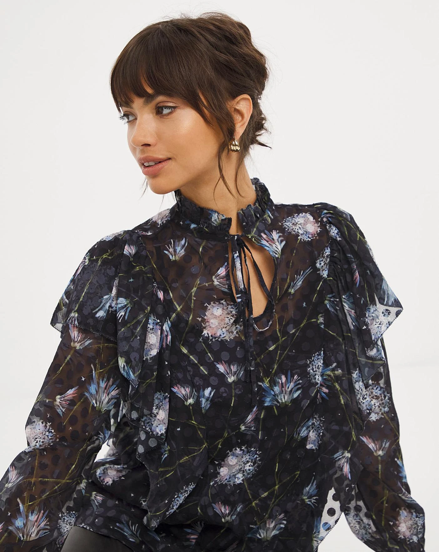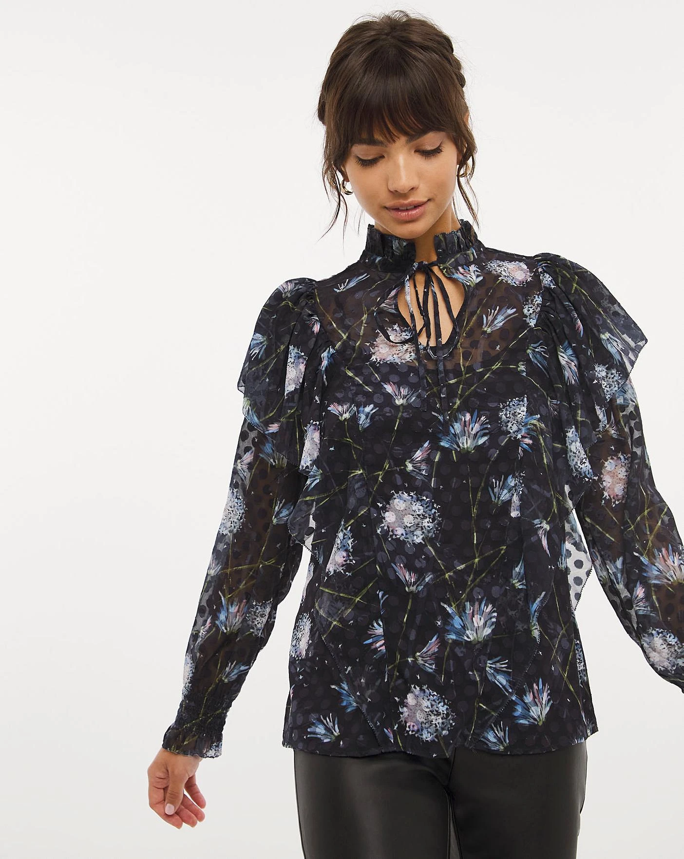 Exclusive to us – Joanna Hope. This lovely dandelion print blouse on a burnout fabric is the perfect going out piece. With a front keyhole, tie neck detail and smocked cuffs this is a truly flattering piece. Comes with a matching cami. Pair with our PU trousers for the complete look.