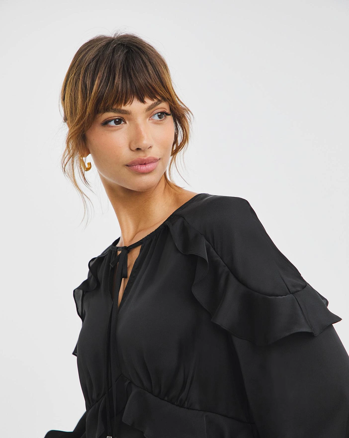 Cut from a sophisticated black satin fabric, our Frill Tie Neck Blouse features delicate frill details across the sleeves and waist seam. This blouse is designed with a functional v-necktie to be worn open or closed. Style with your favourite heels for a sleek day to night look.
