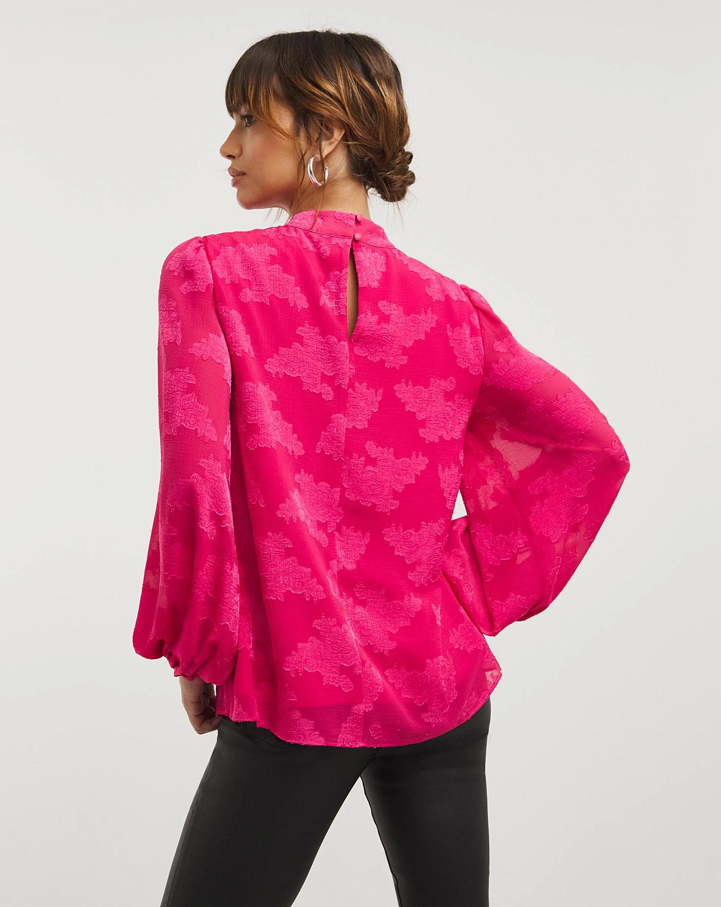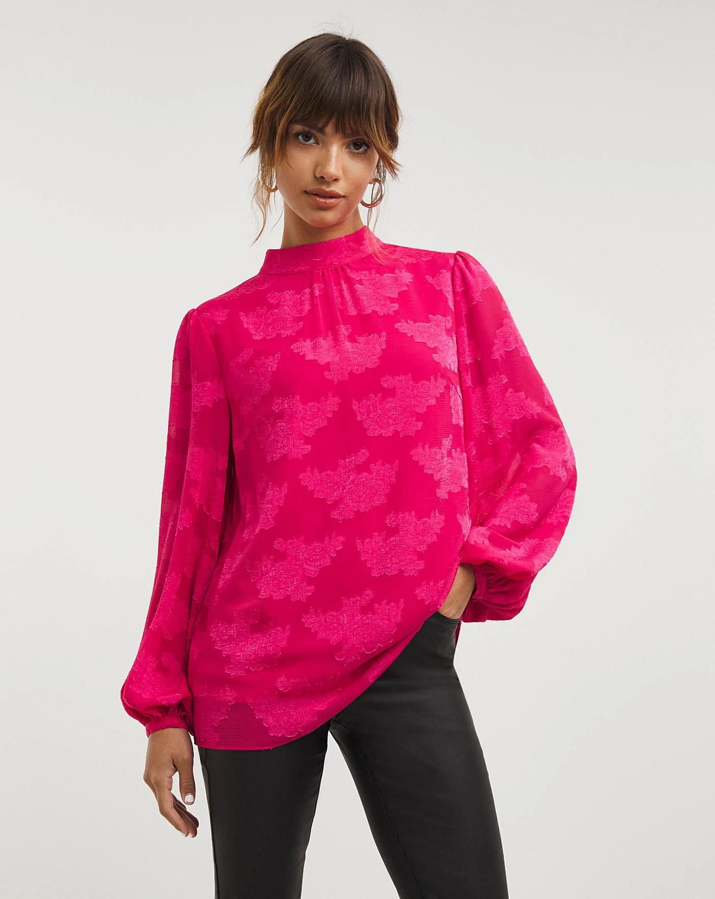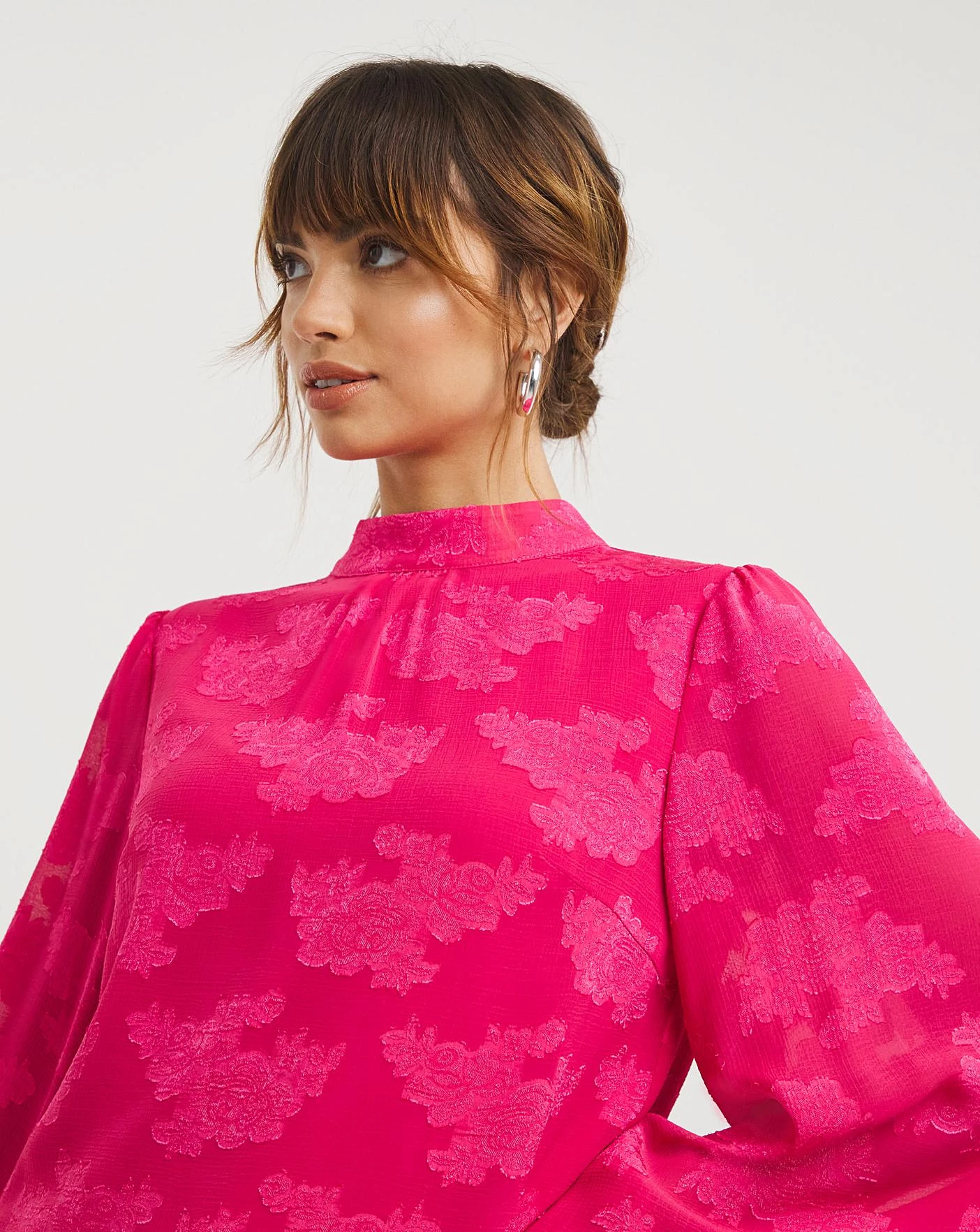 In a stunning vivid pink shade, on a beautiful satin fabrication, this on-trend burnout design features a delicate floral pattern throughout. Designed with beautiful volume sleeves, lined with covered buttons, and elasticated cuffs for comfort. Our Joanna Hope blouse is crafted with a modern high neckline and is the perfect piece to take you from desk to dinner.