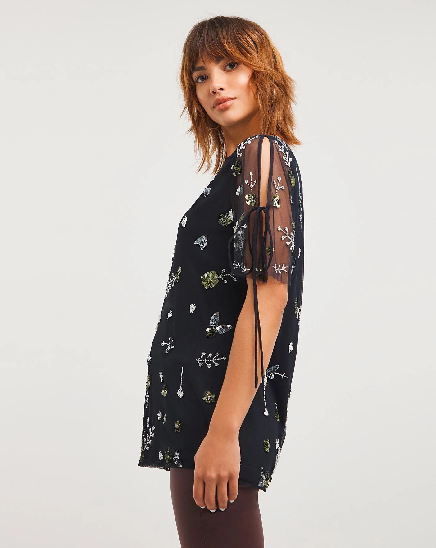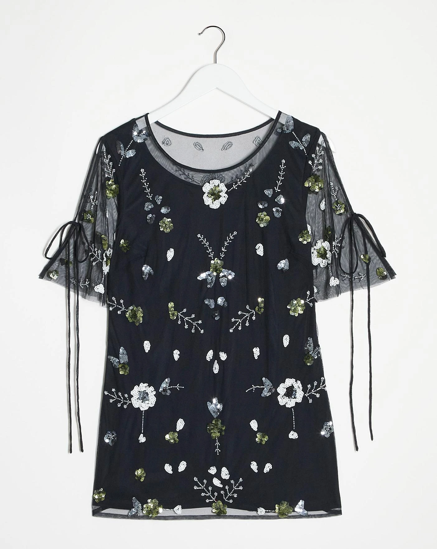 This stunning Joanna Hope mesh sequin blouse is designed with intricate sequin detailing. Complete with breathable, mesh and tie detail short sleeves. Perfect for your next occasion.