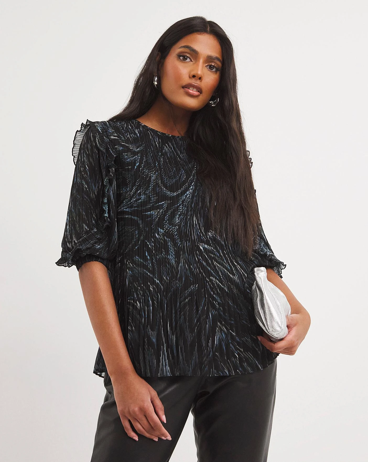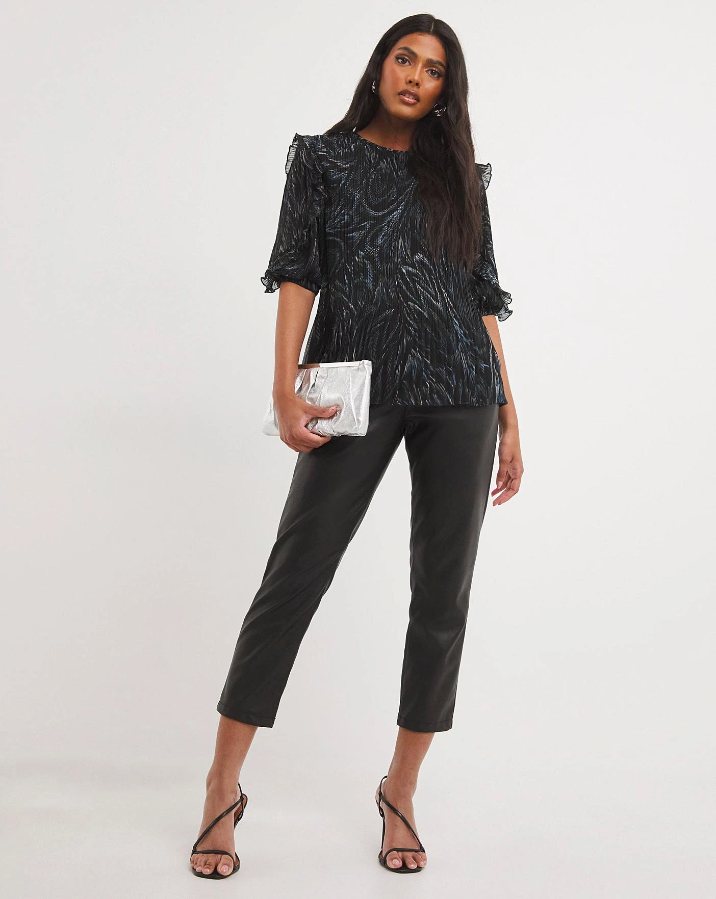 In a cool micro-pleat fabrication, this top will see you through the transitional months. Designed with a round neckline, a keyhole closure with a button opening, and pretty frill sleeves. Style tucked in or out with PU trousers, grab your favourite heels and you are good to go.