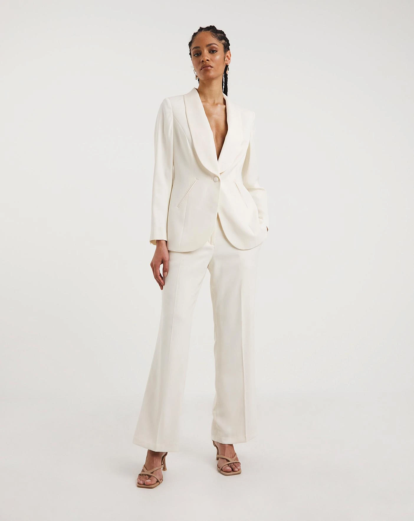 Perfect for an elegant wedding or rehearsal dinner. This sophisticated ivory, fitted bridal suit is crafted from a luxurious satin back crepe. These beautiful trousers are elegant and structured. They feature a button front, and back pockets, with a stunning flare leg shape. . A modern statement on classic look.