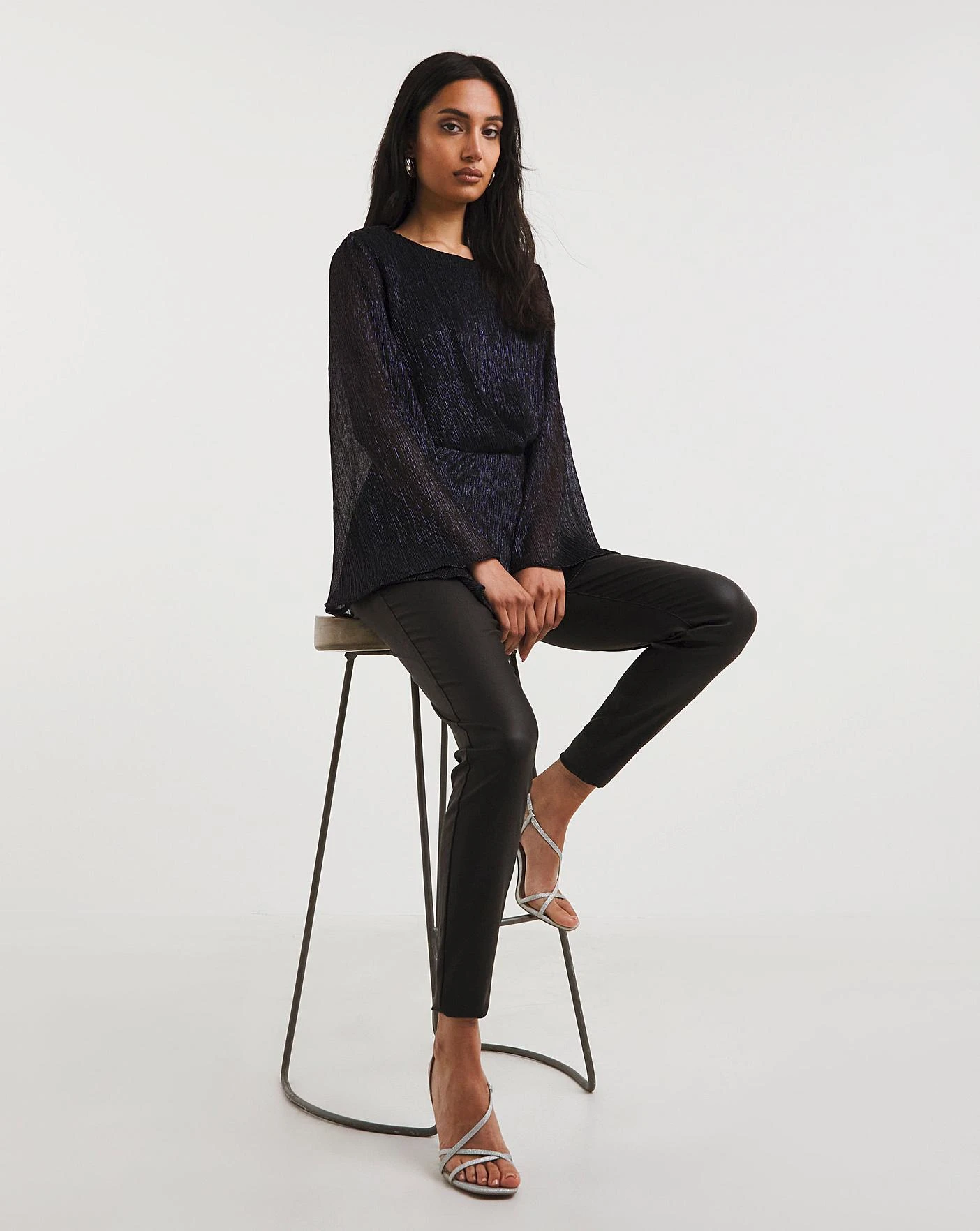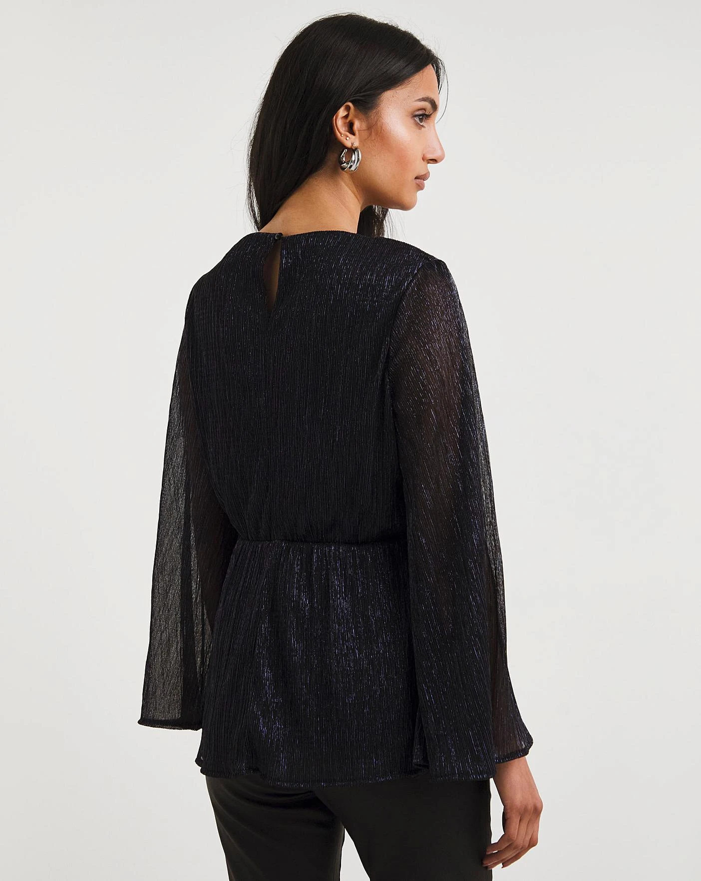 In a glitzy metallic plisse, this blouse is a super glamourous occasion wear piece! In a figure-flattering peplum shape, our designers have included elastication in the waist for ultimate comfort. Fully lined throughout the body with unlined flowing sleeves. Pair with your favourite heels to complete your evening look.