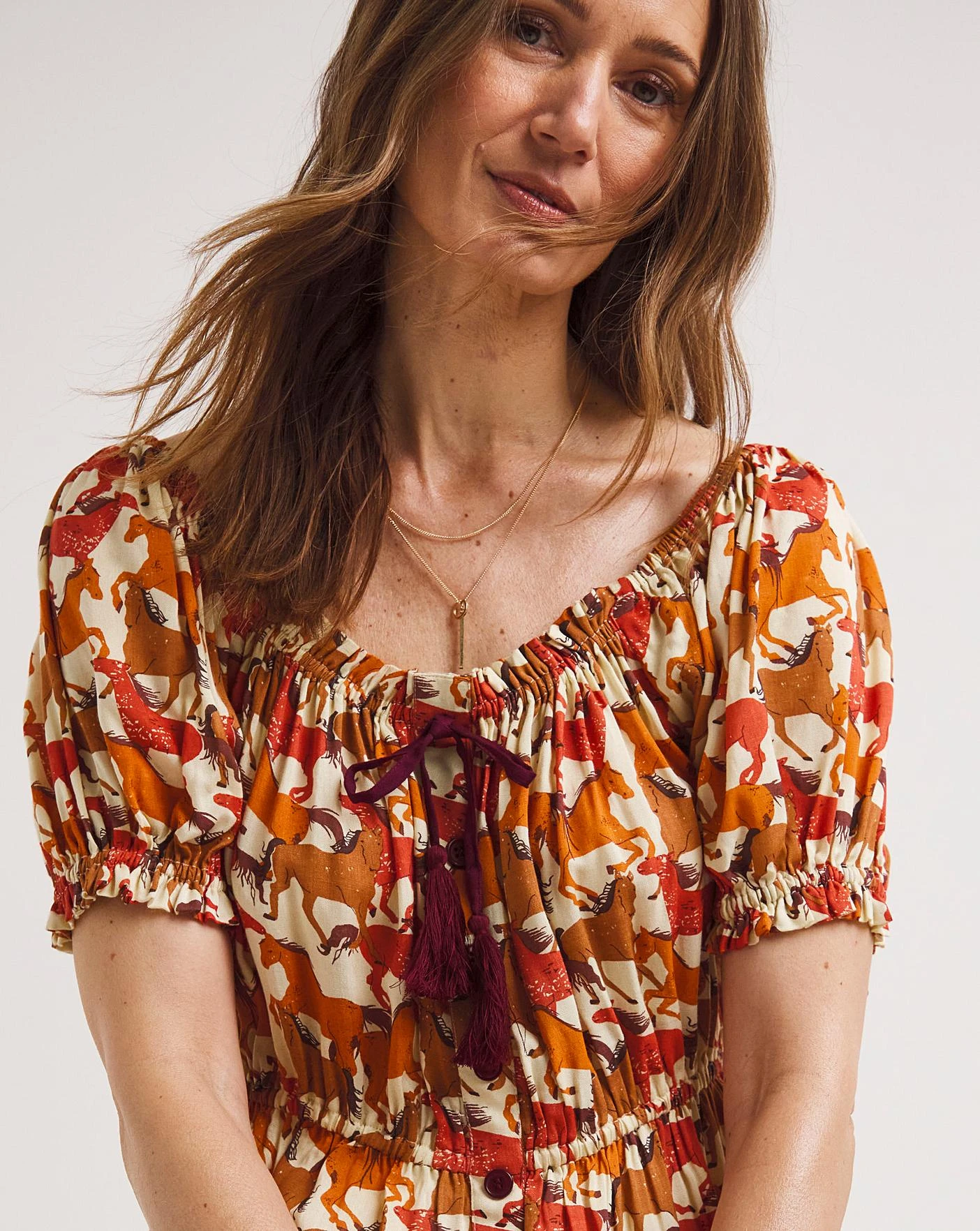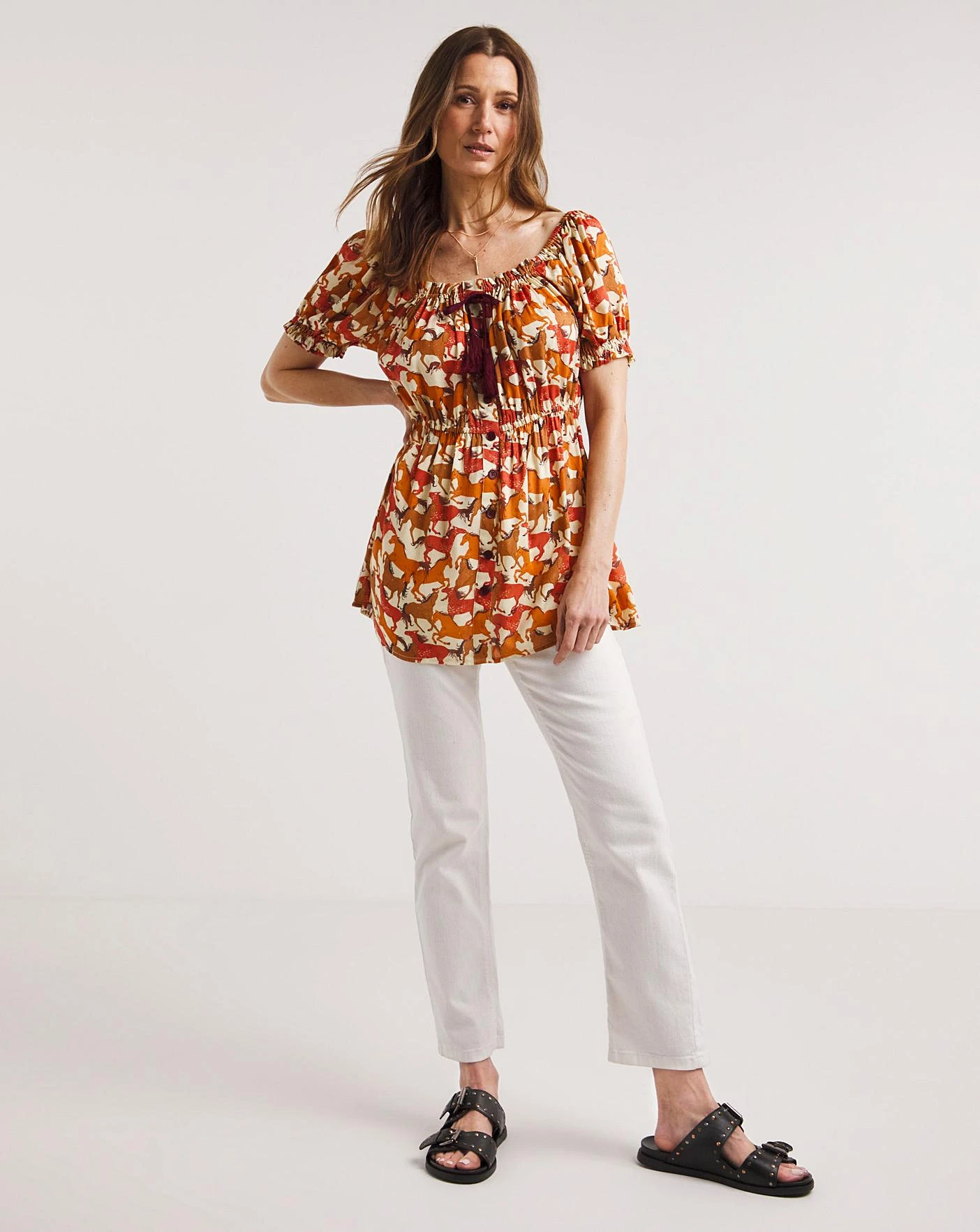Enjoy a Western vibe in your springtime style with this beautiful boho ladies top. Because it’s full of rich colours that make the bold print really stand out, it certainly gives off a distinctive feel. Topped with puff sleeves and a placket on the front, just add jeans for an easy wearing seasonal look that you’ll go wild for.