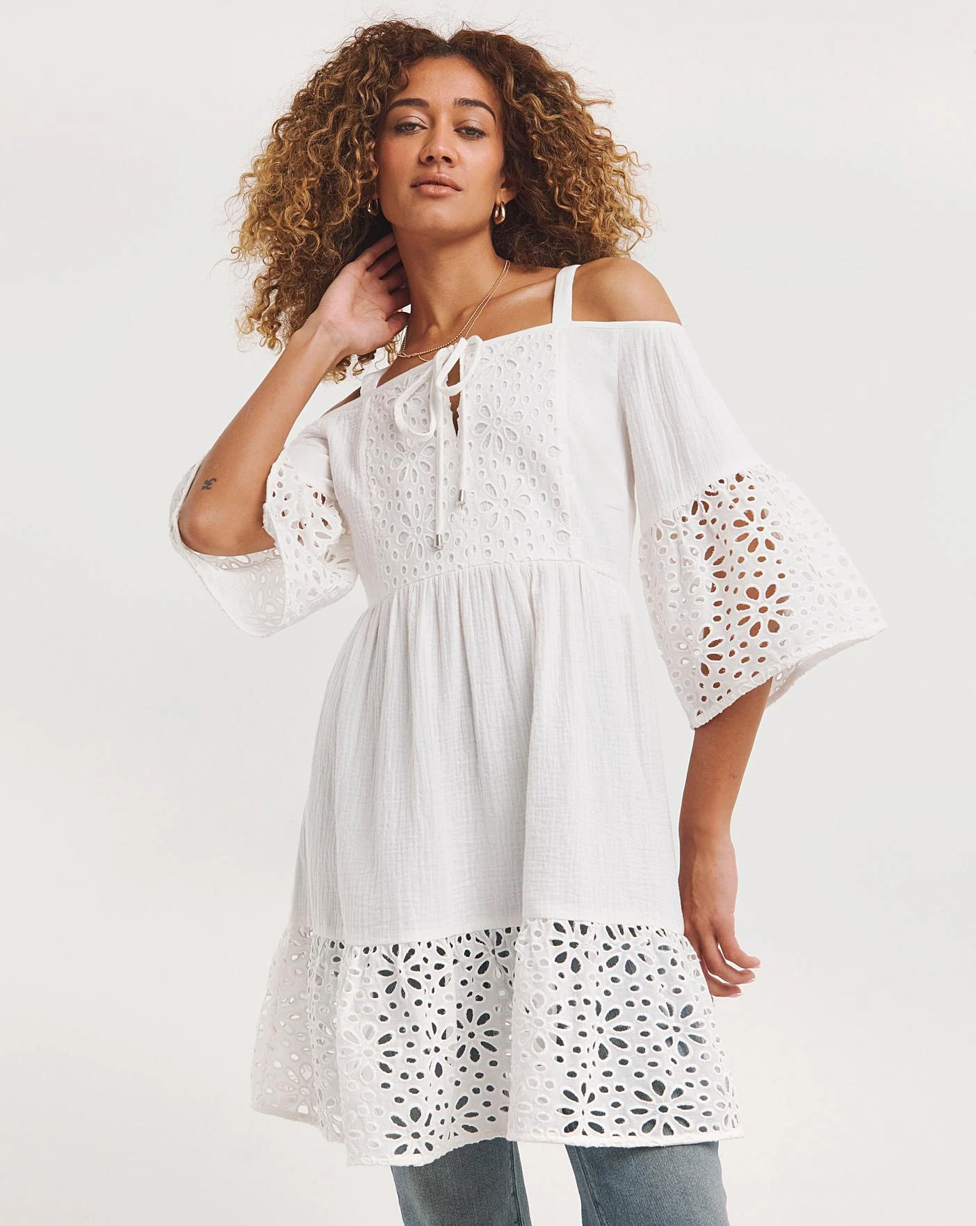 Sophisticated and feminine, this cold shoulder top is perfect for the summer. Featuring crochet and tie details its super elegant. In a gorgeous cheesecloth fabric with loose sleeves it means it is perfect to keep you cool and comfortable.