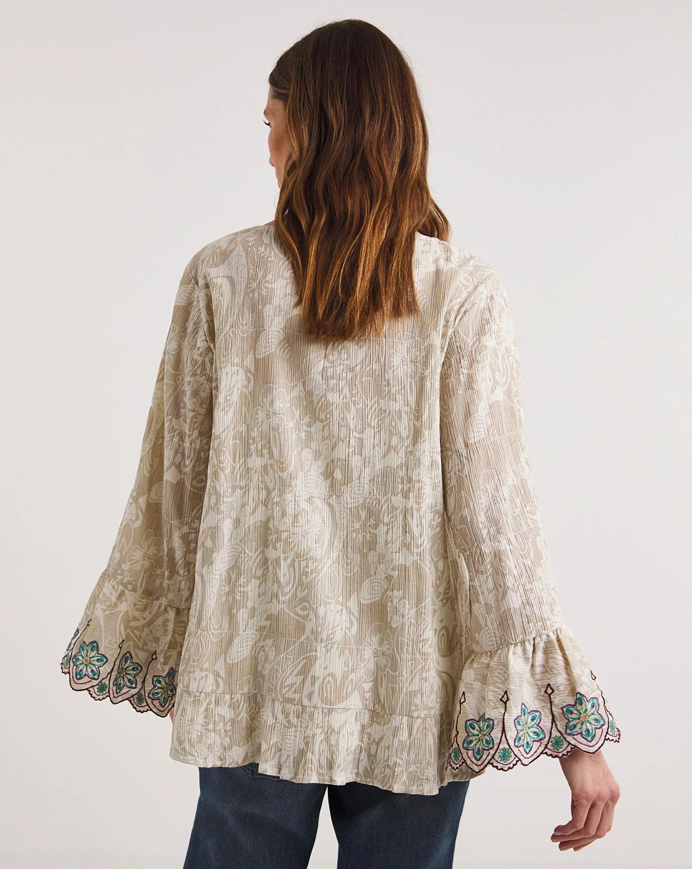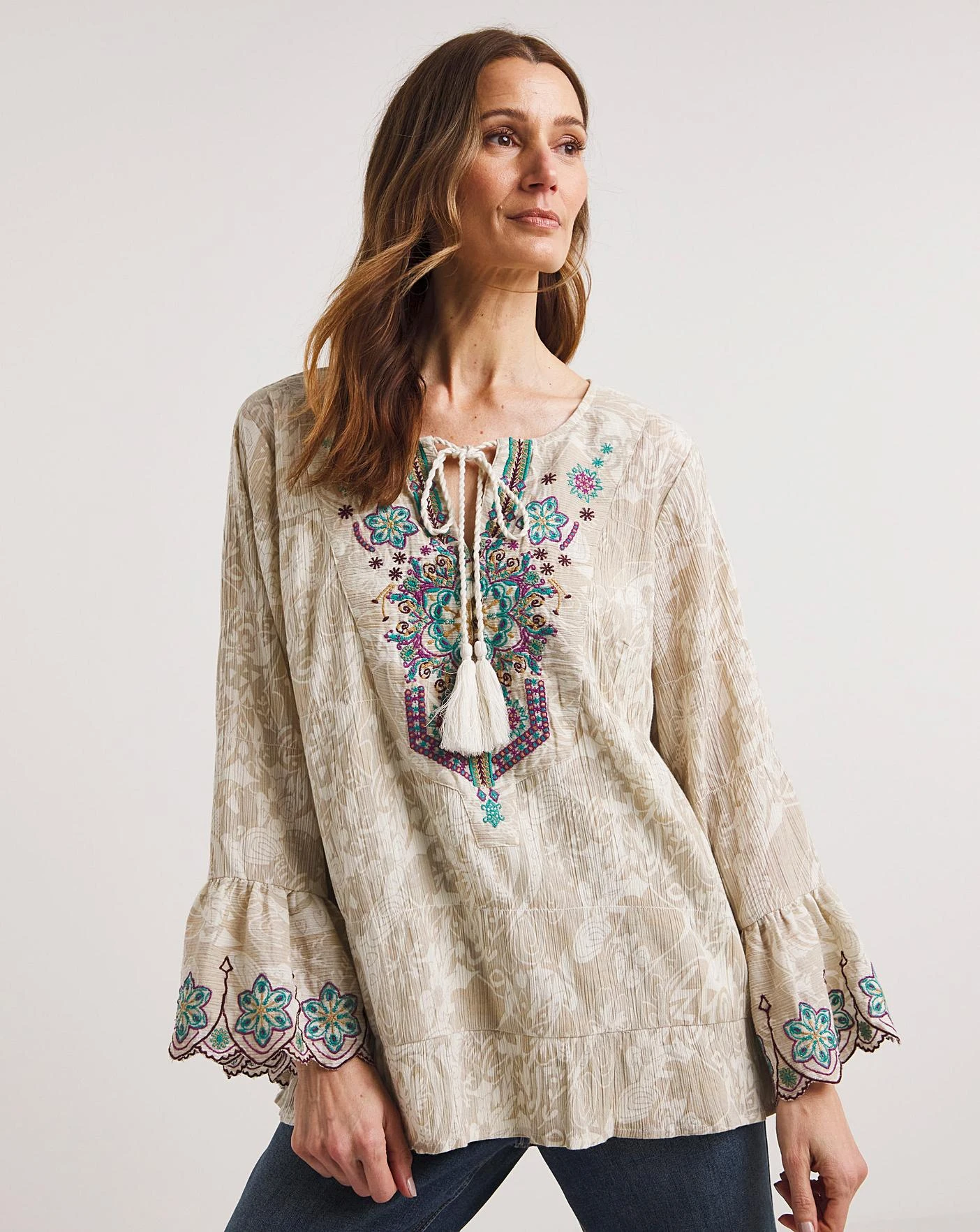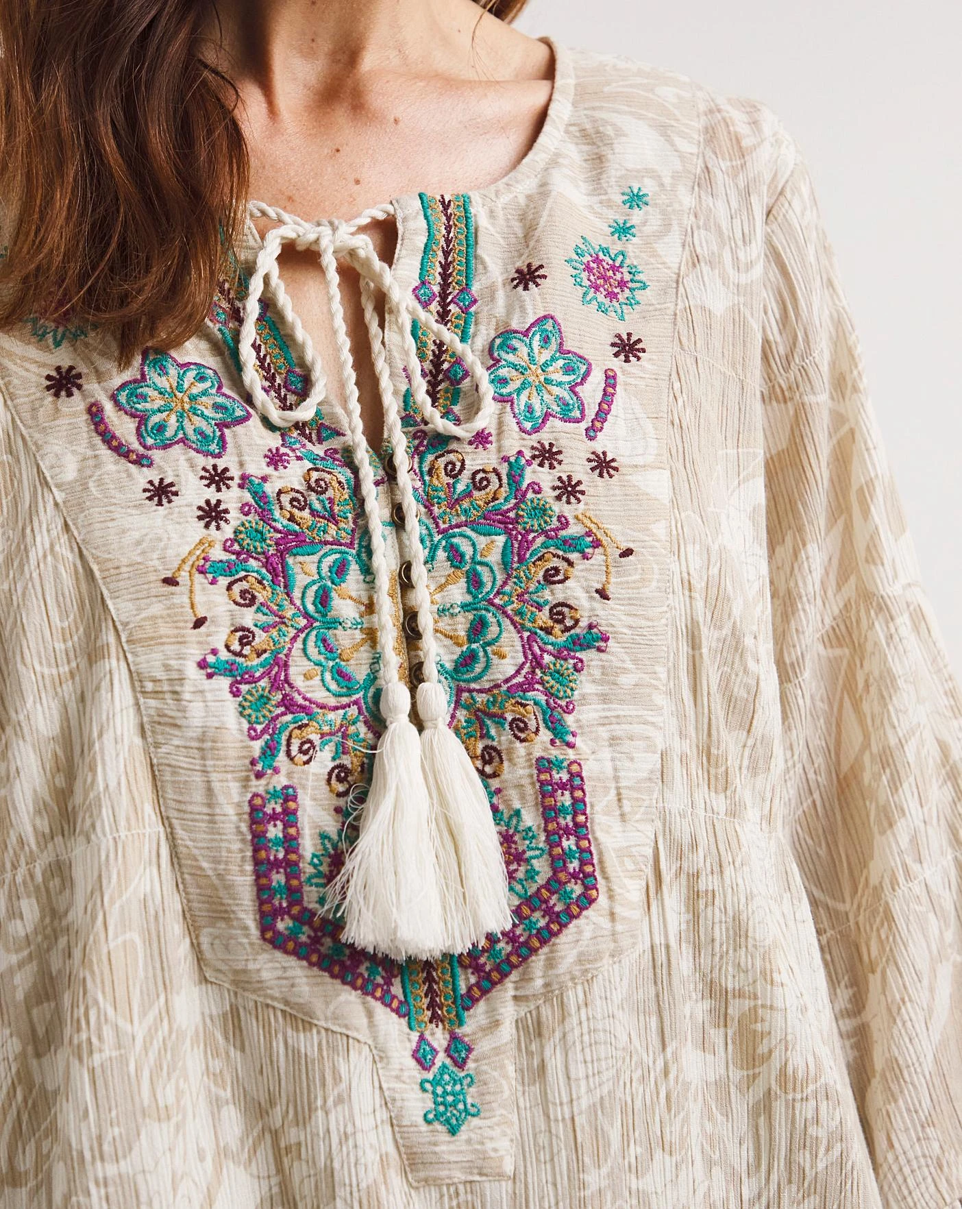 Choose this stunning tunic and you’ll add a totally remarkable piece to your seasonal wardrobe. We love the lightly printed design and gorgeous embroidery – so delicate and unique, it makes a real statement style. Topped off with flared sleeves and tassel ties, you’ll look so majestic while feeling incredibly floaty and free. This lightly printed tunic will make a real summer style statement.
