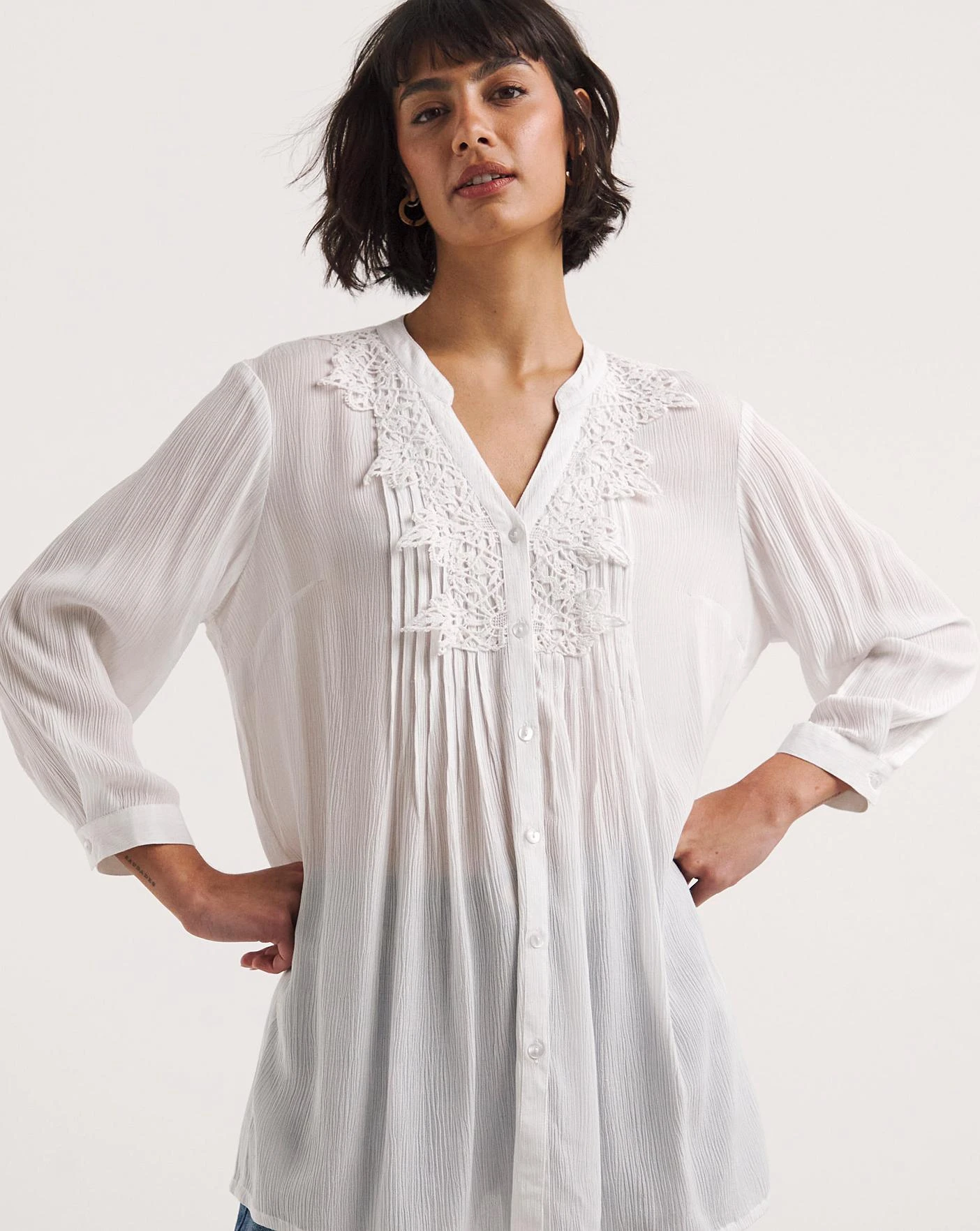 A stylish white blouse is a real vintage must-have, and we’re in love with this three-quarter sleeve blouse. Just take a look at the subtle buttons, pintuck detailing down the front and the intricate lace down the neckline of this stylish white blouse. Crafted from gorgeously soft crinkle fabric, you’ll feel and look remarkable in our fabulous floaty blouse.