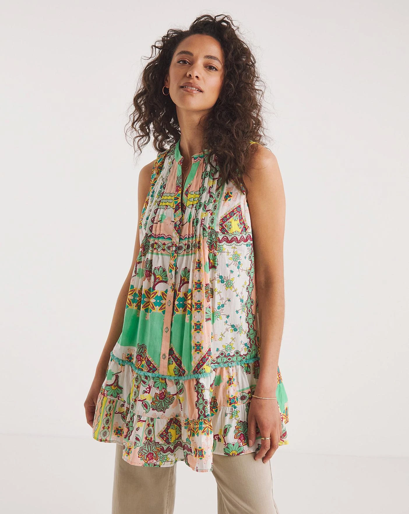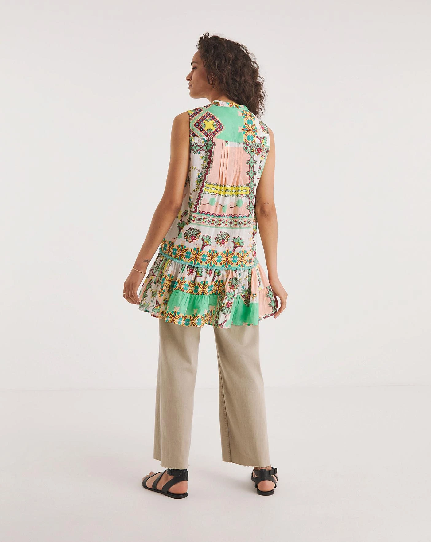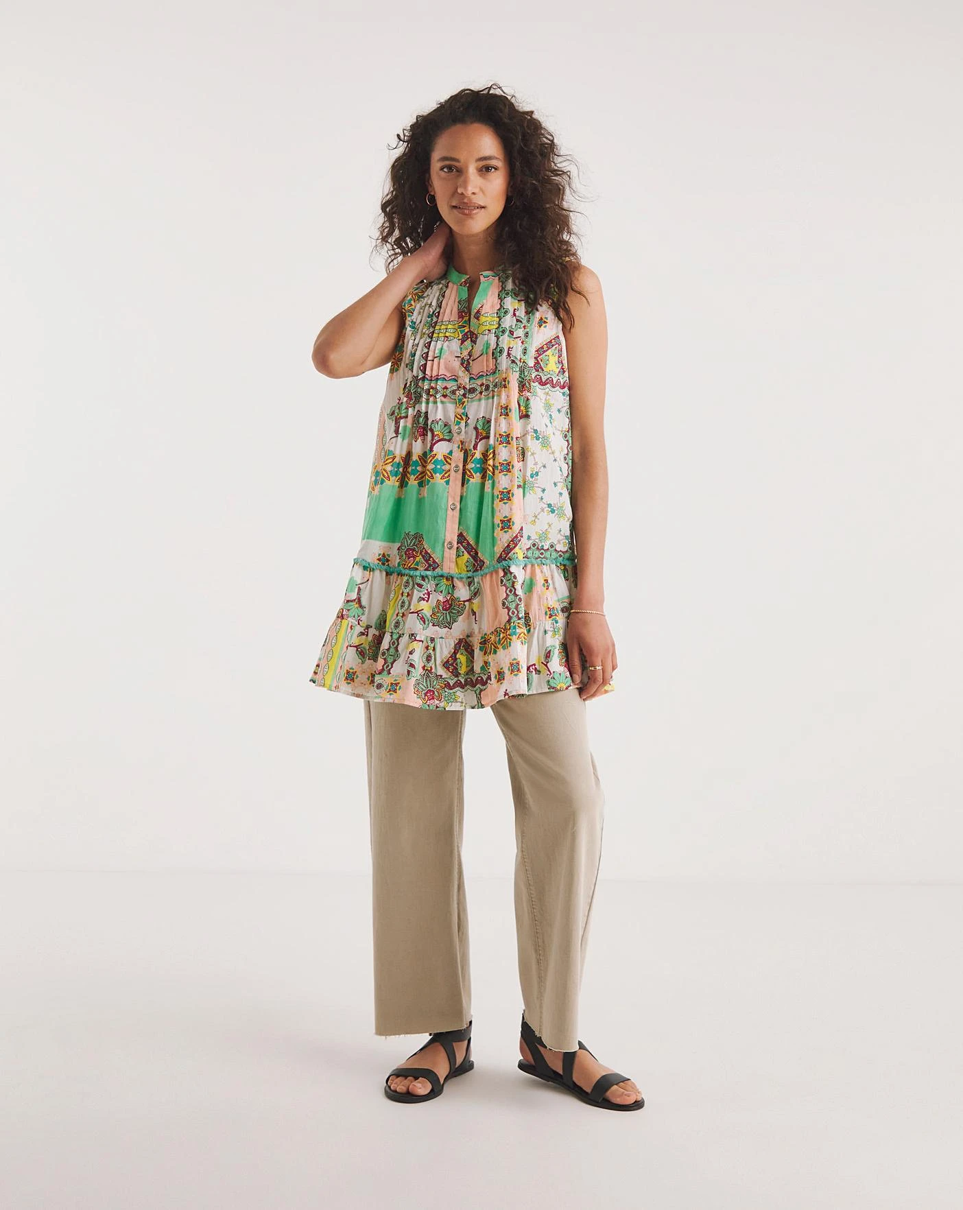 If you’re looking for gorgeous seasonal colours, look no further than this tunic. Whether you wear it with your favourite short or light trousers, you’ll love how the flowing shape, sophisticated collar and the playful green trim work together to bring you this fabulous summer statement tunic.