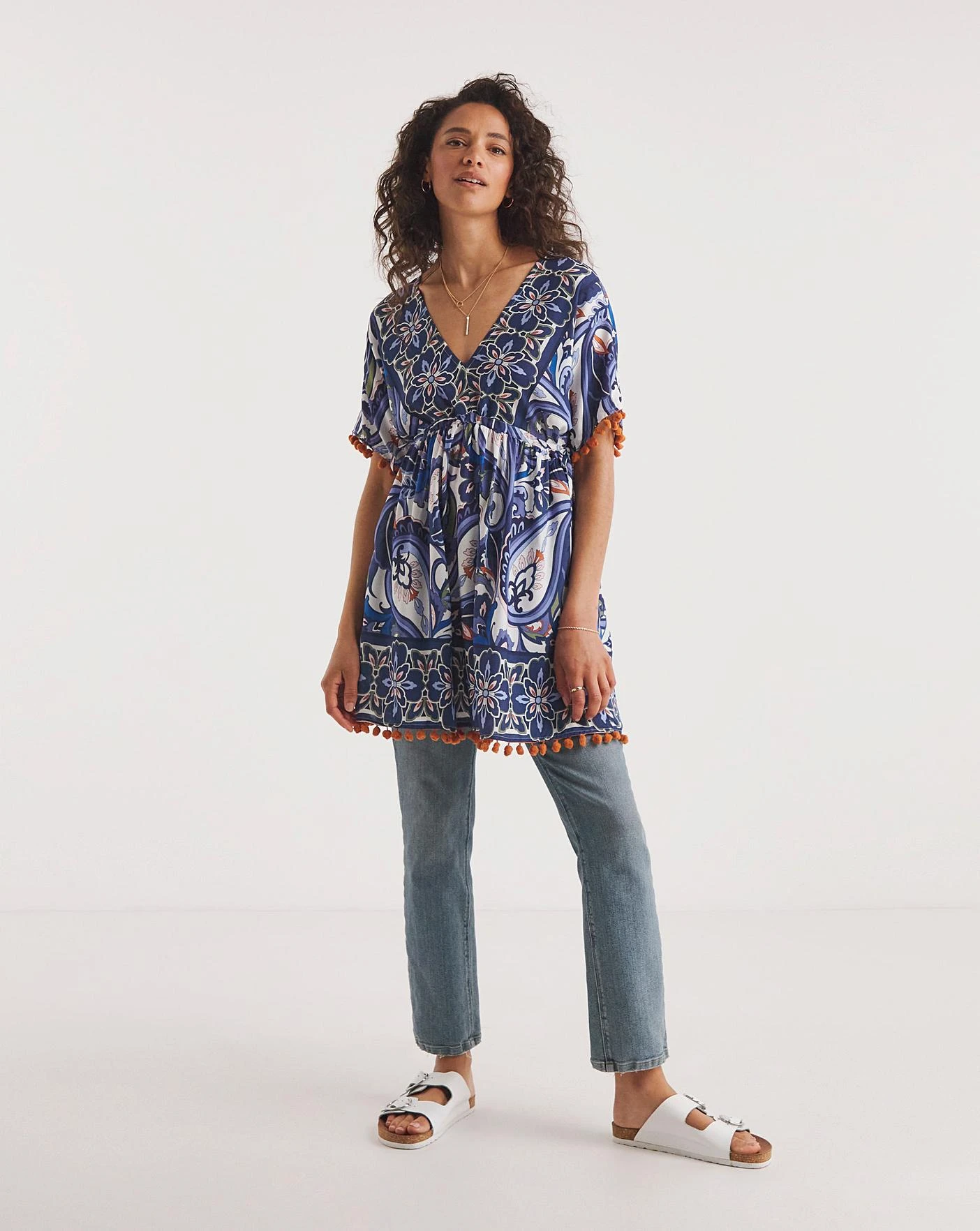 This tunic has a remarkable pattern and mesmerising colour palette. You’ll love how the pom poms pop against the fabric – it helps to create such an eye-catching style. Oozing boho vibes, this top is perfect for any unique look, whether you pair it with jeans and boots, or shorts and sandals.
