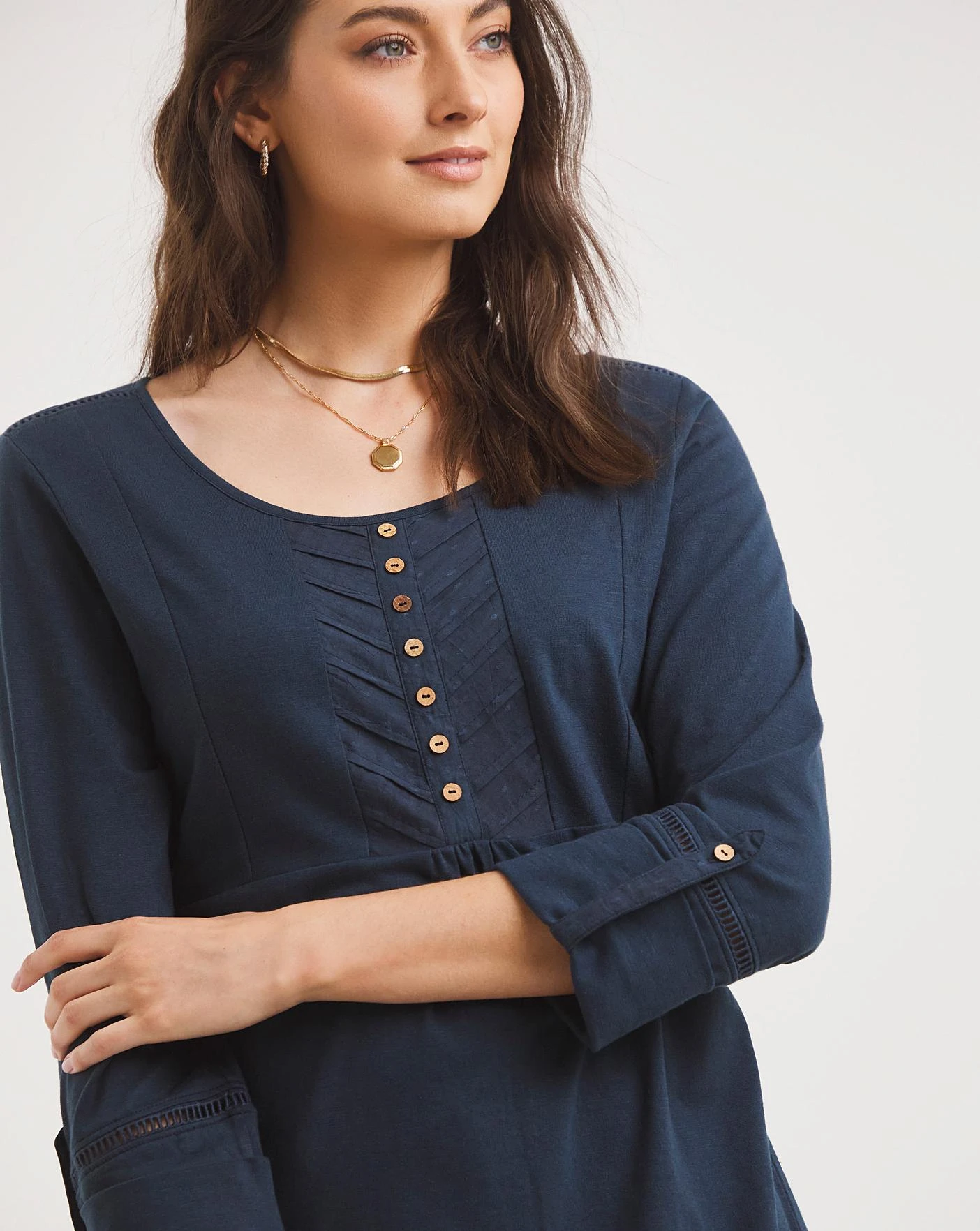 Cut from a cotton jersey fabric, this top is designed with wooden buttons and placket tucks for added detail. Pair yours with jeans and casual shoes for an everyday look.