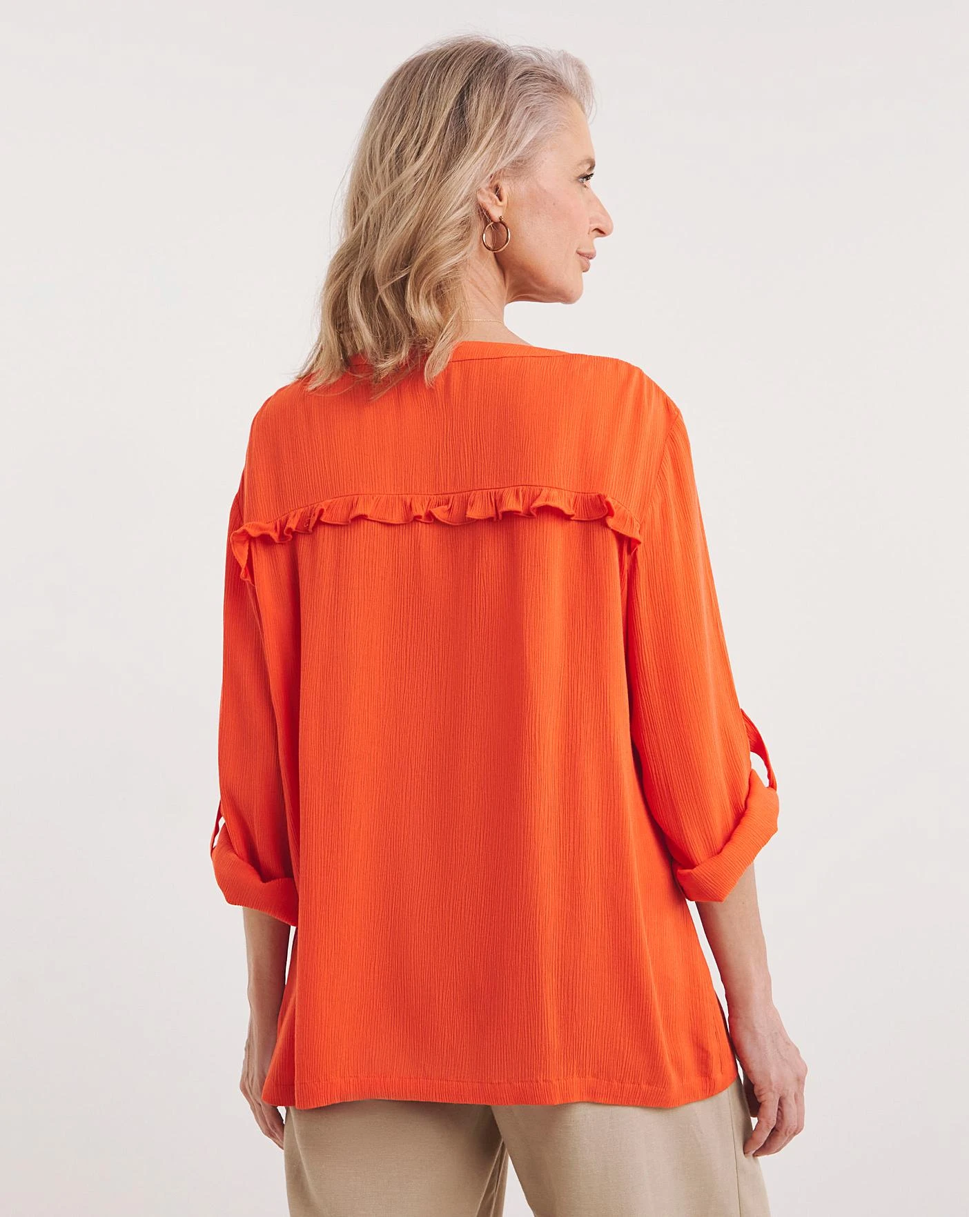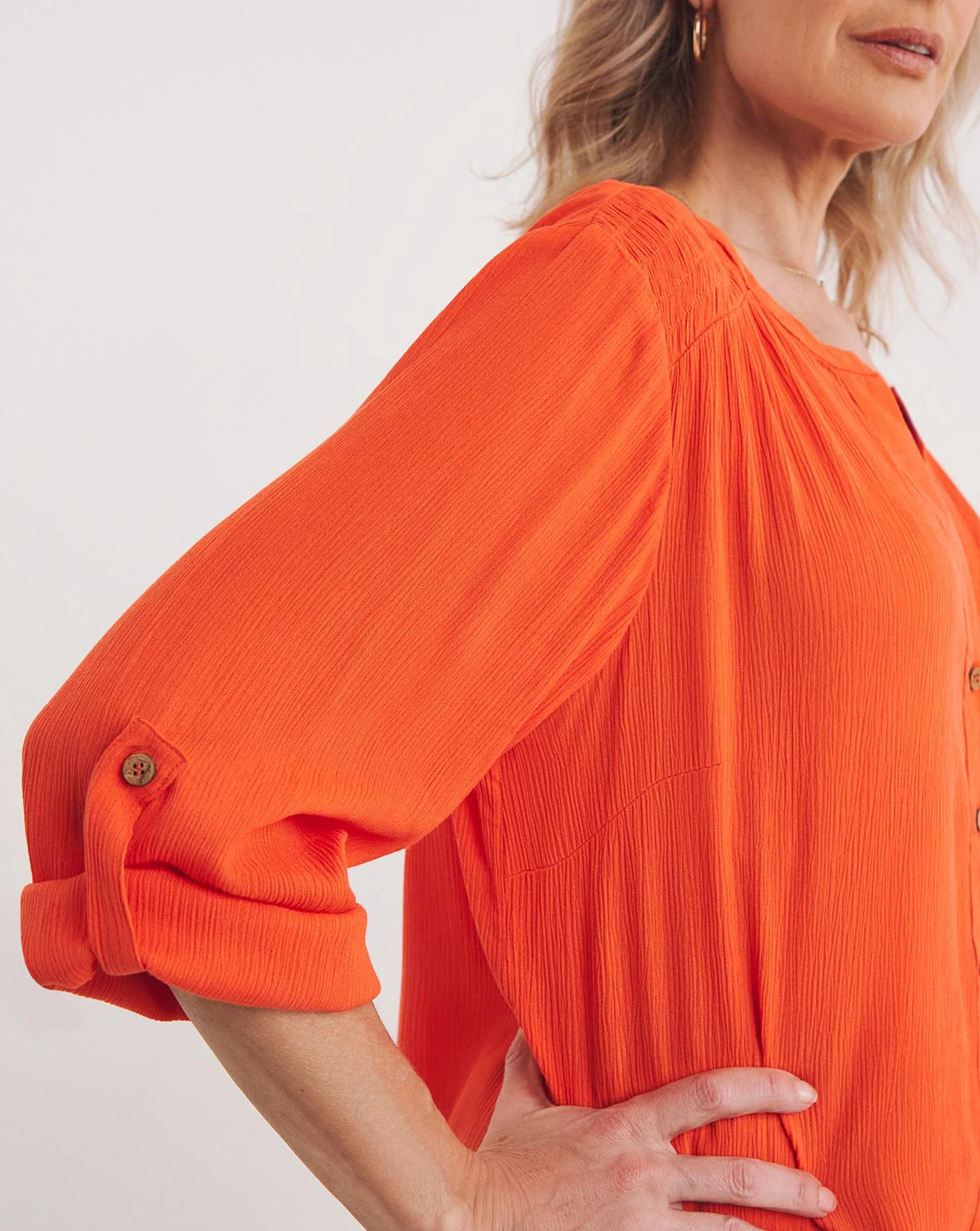 In our new shape, this button through top features shiring around the neckline and roll up sleeves made for your comfort. Adorned in a bright crinkle fabric.