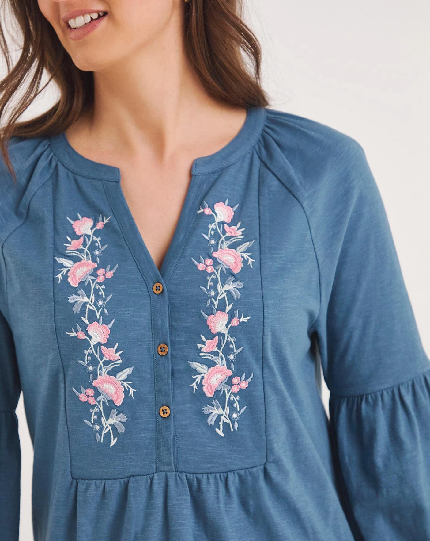 Add this embroidered jersey top to any outfit to create a comfy yet fashionable look. The gathered sleeves and notch neckline creates a flattering design. Made by BCI cotton; by choosing our cotton products, you are supporting Julipas investment in Better Cottons mission. This product is sourced via a system of mass balance and therefore may not contain Better Cotton.