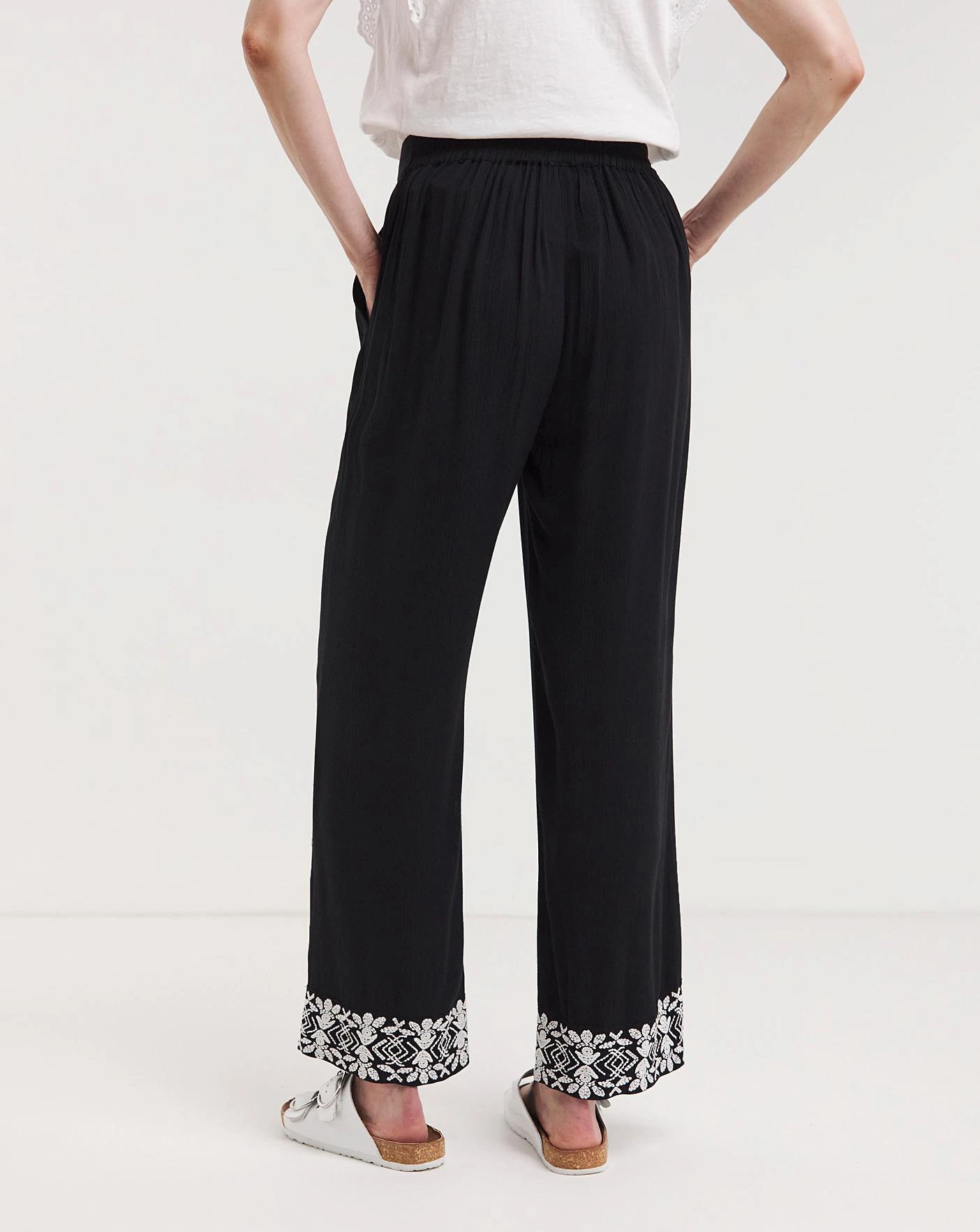 Made from a non iron crinkle fabric, this embroidered trouser is both comfy and stylish. The design features an elasticated waist and pockets.