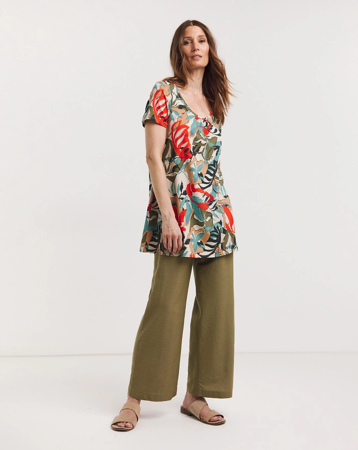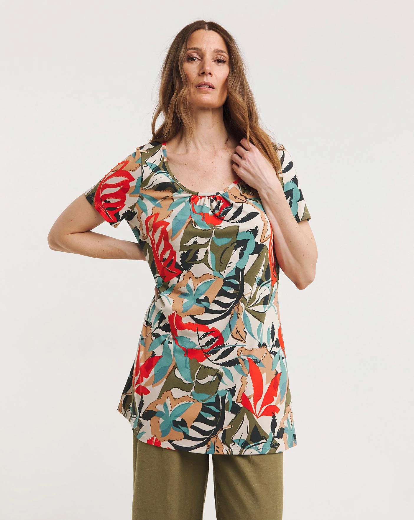 This jersey tunic features a beautiful all over print with a round neck and short sleeves. The tunic length is perfect to wear over your jeans.