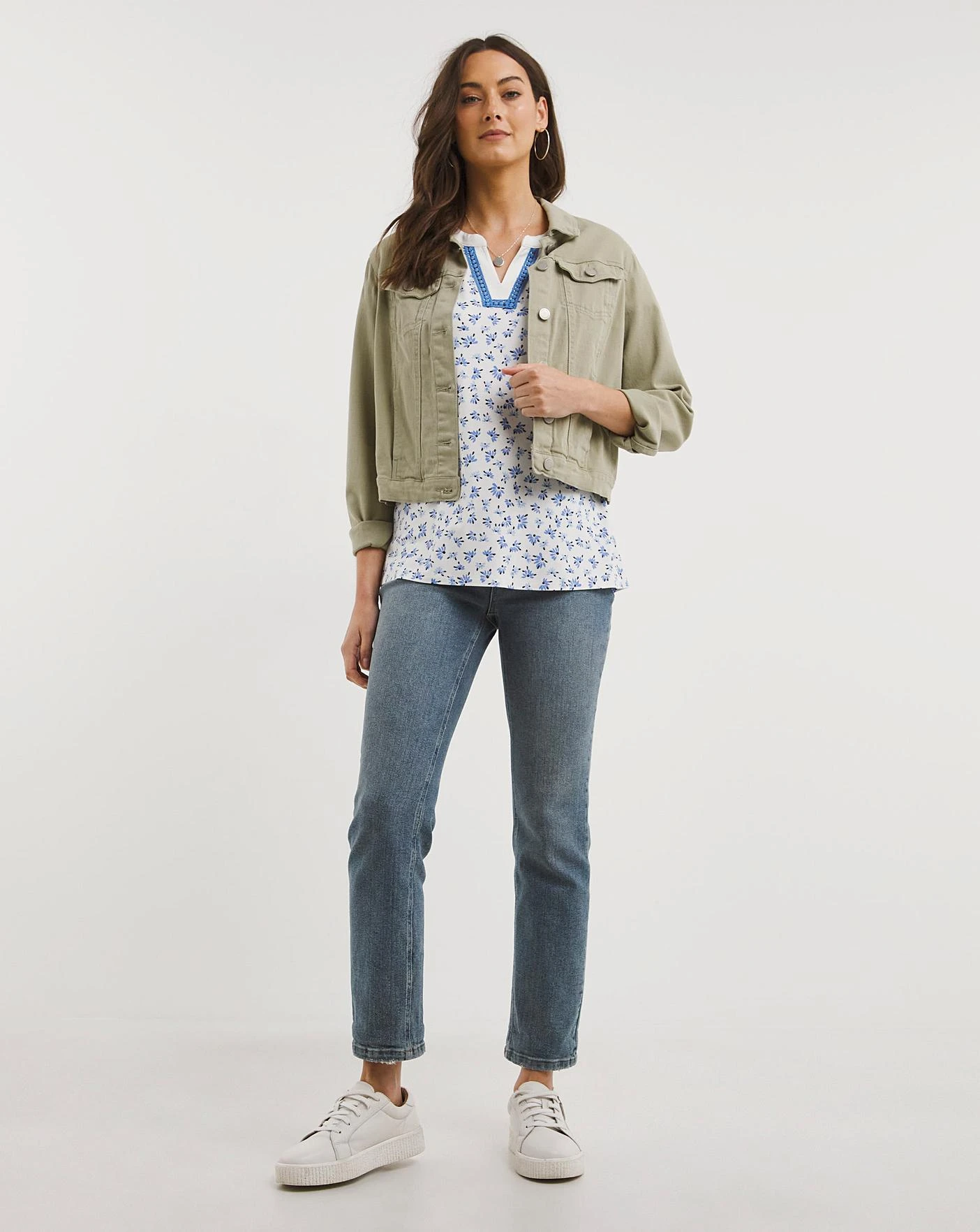 This classic viscose elastane mix jersey top features a subtle notch neck with beautiful lace detailing. In a stylish all over print in a stretch jersey fabric, this is a versatile every day piece.
