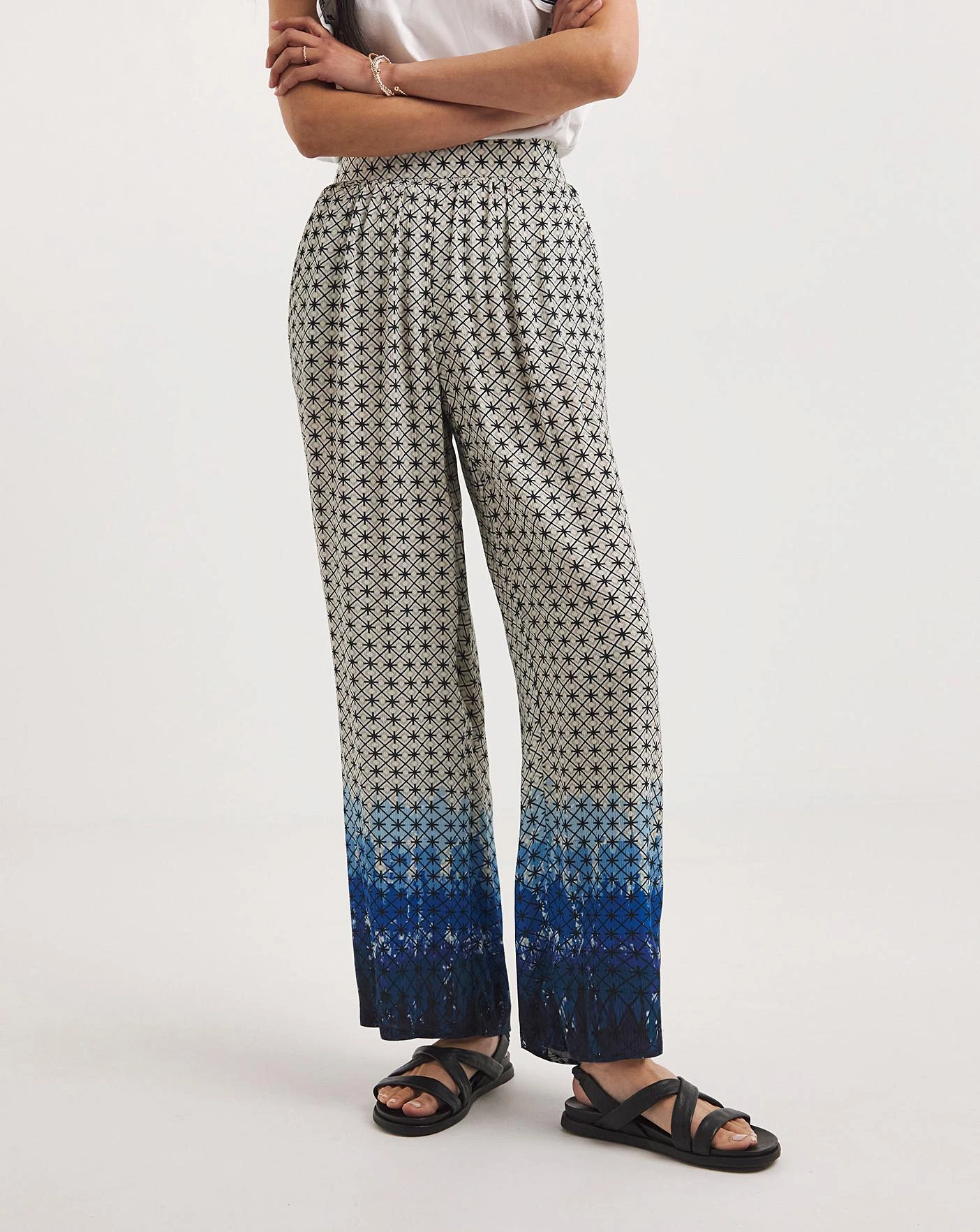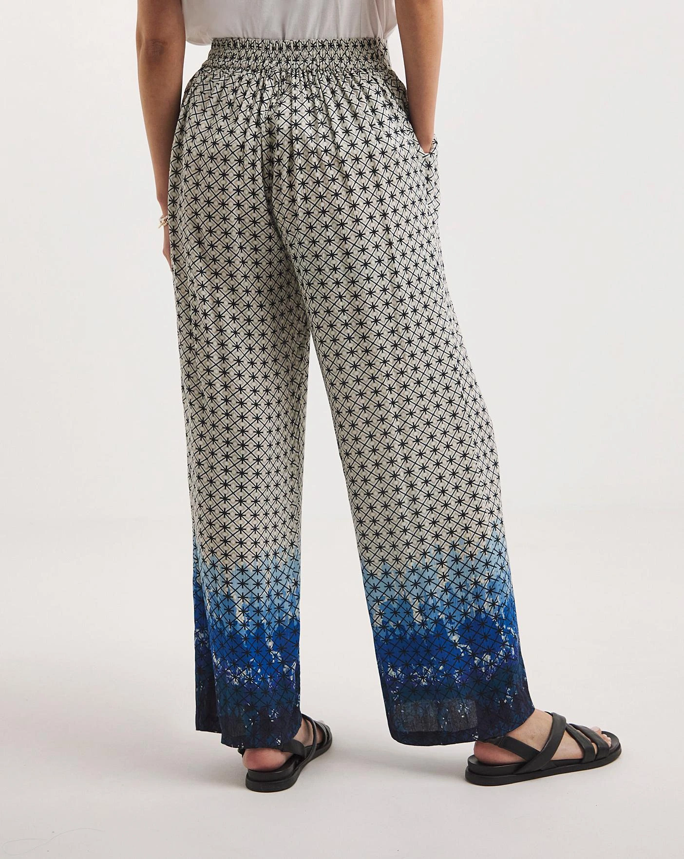 Made from a non iron crinkle fabric, this embroidered trouser is both comfy and stylish. The design features an elasticated waist and pockets.