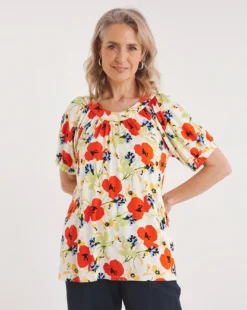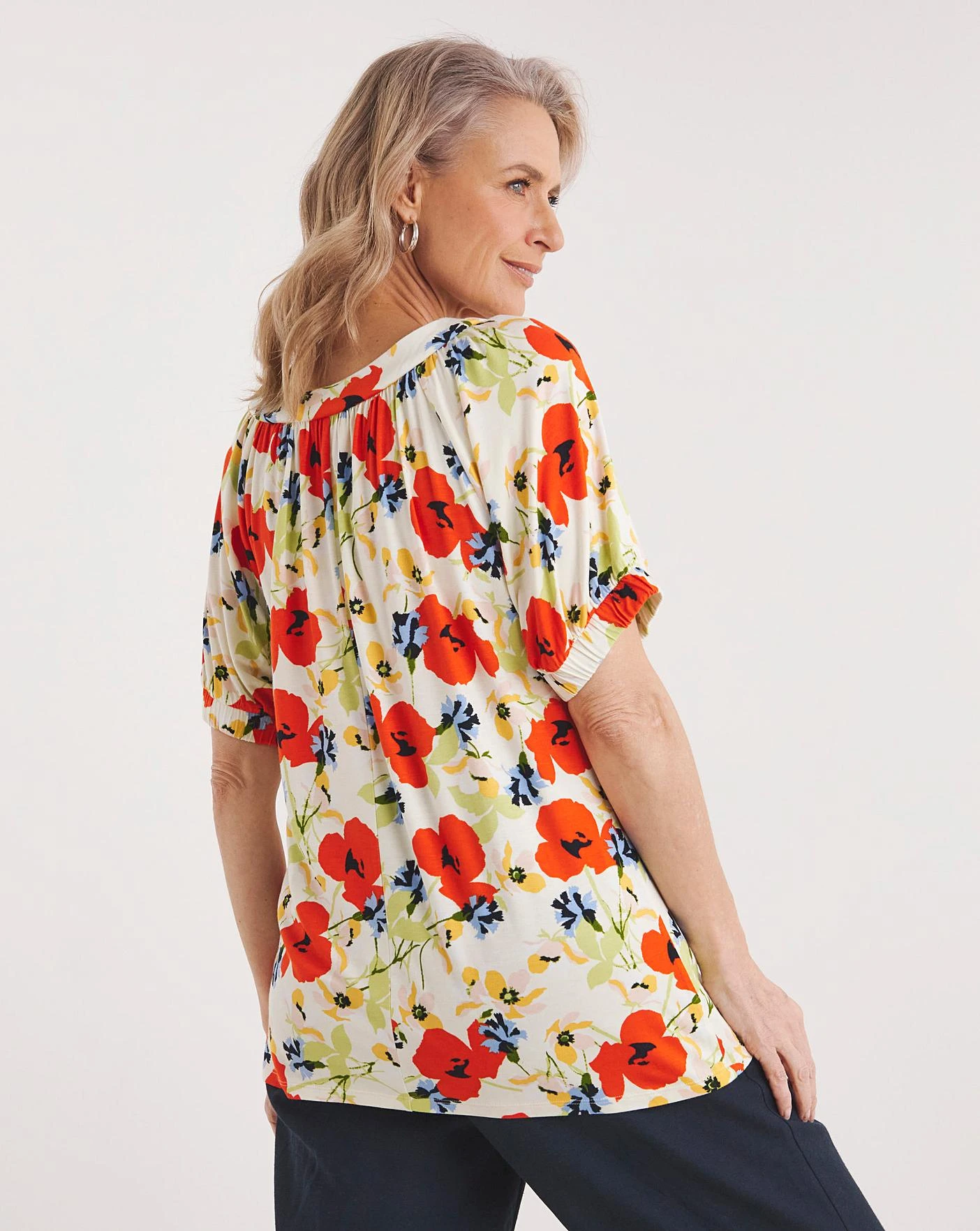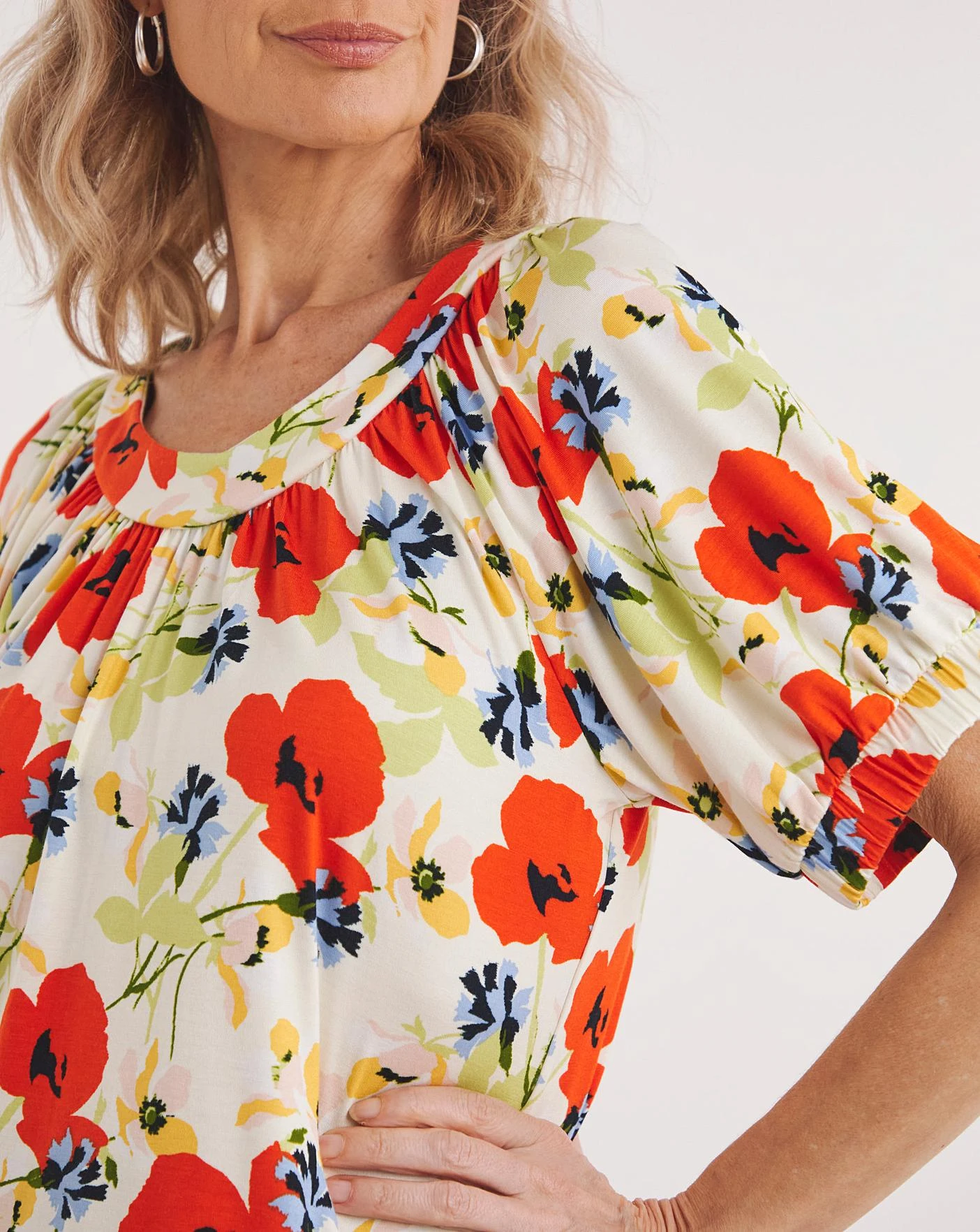 In our best selling shape, this puff sleeve jersey tunic is the perfect piece to style with jeans. Featuring a round neckline, short sleeves and elasticated cuffs for comfort. Made from a sustainable viscose fabric.