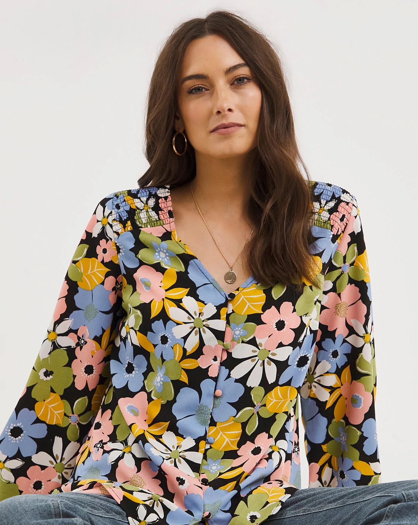 Pair this printed blouse with jeans and boots for a casual spring look. Design features include shirred shoulder details, volume sleeves and wooden button down fastenings.