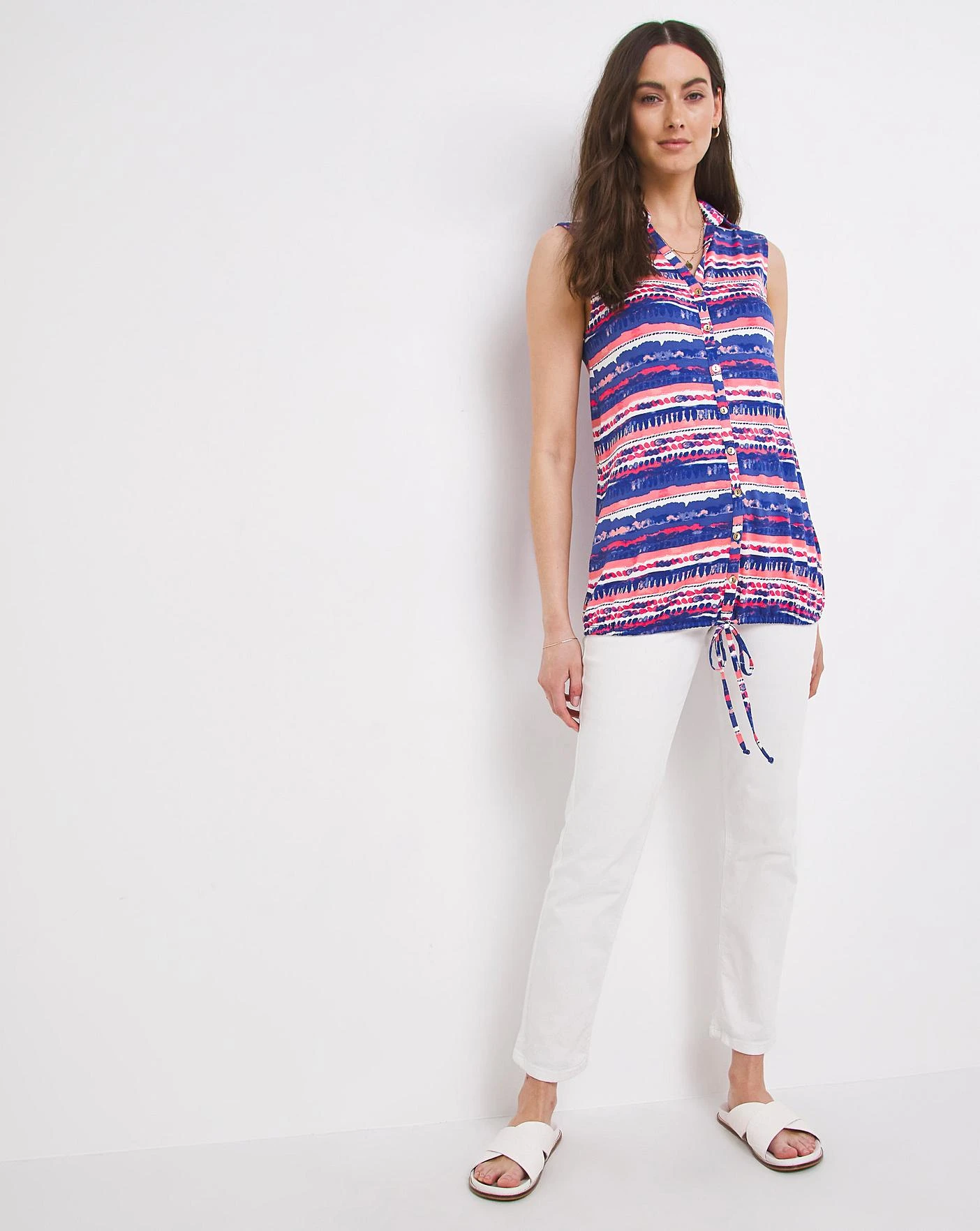 This sleeveless jersey shirt comes in a stylish print and lightweight stretch fabric. It buttons all the way down and is completed with a tie at the bottom. Pair with jeans or shorts for an easy and comfortable day time look.