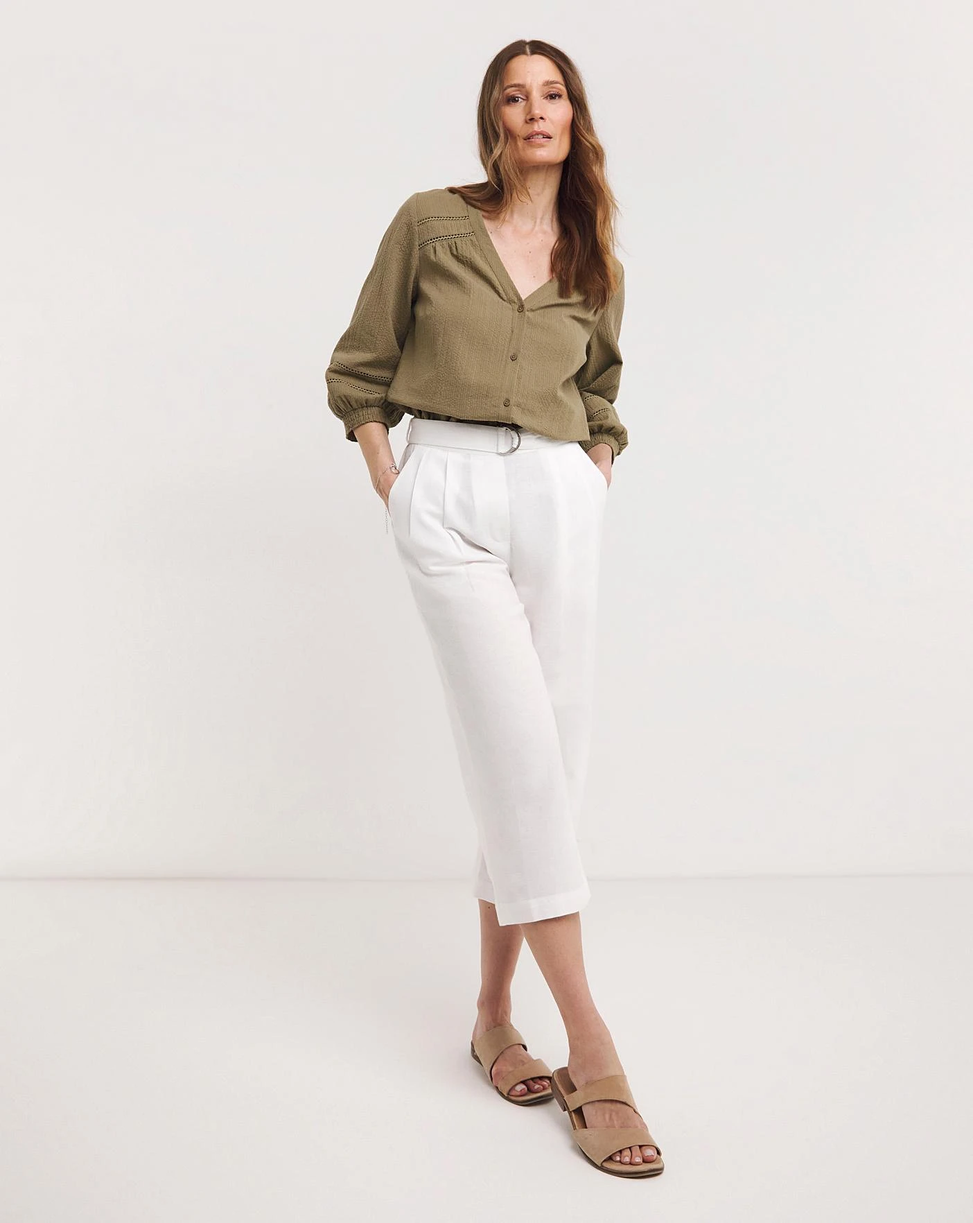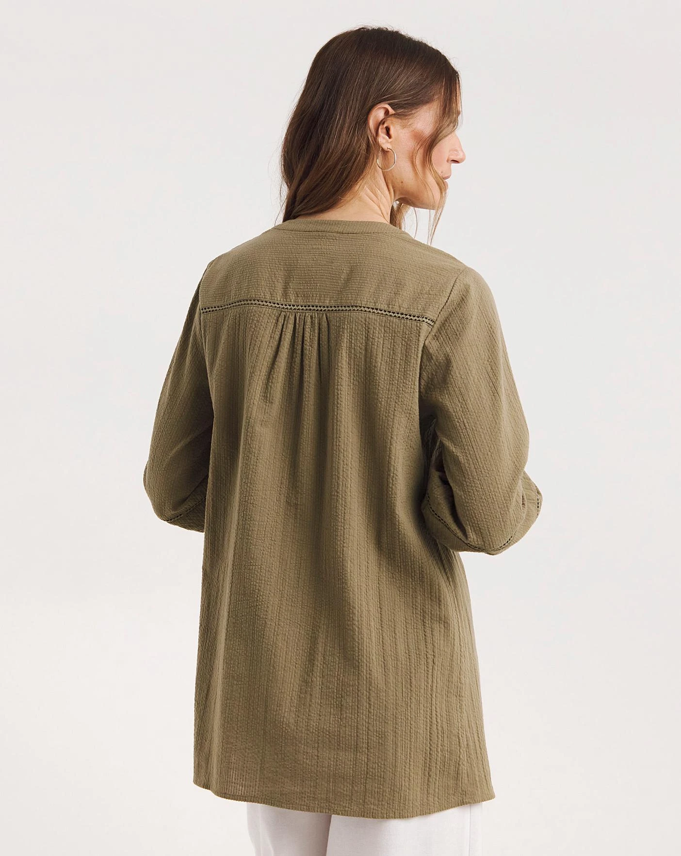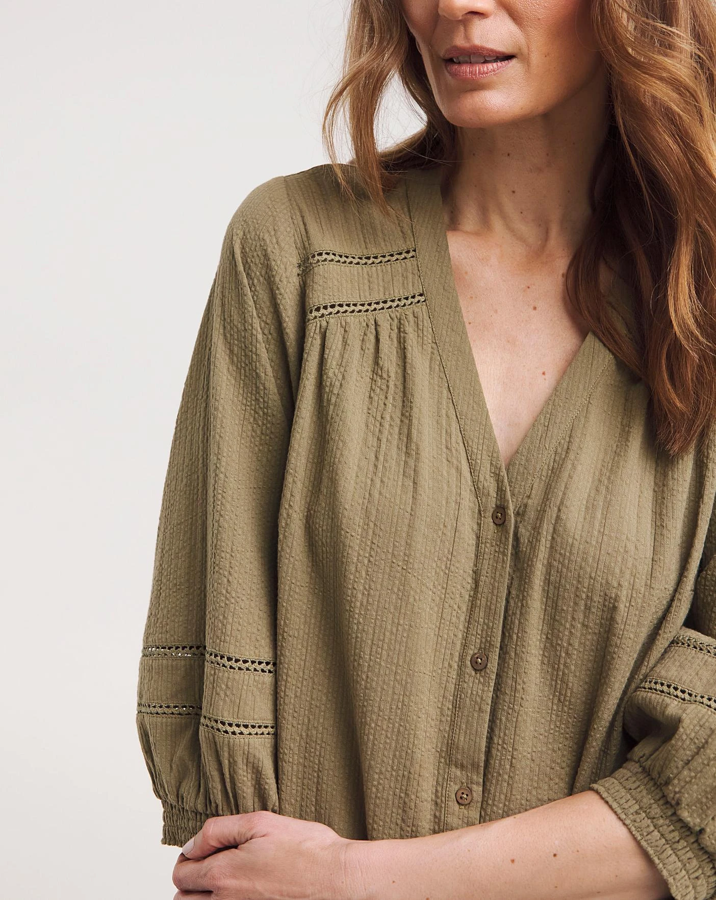 This textured lace trim blouse in khaki is the perfect throw on blouse. Designed with three quarter length sleeves and button through fastening. Made from BCI cotton.