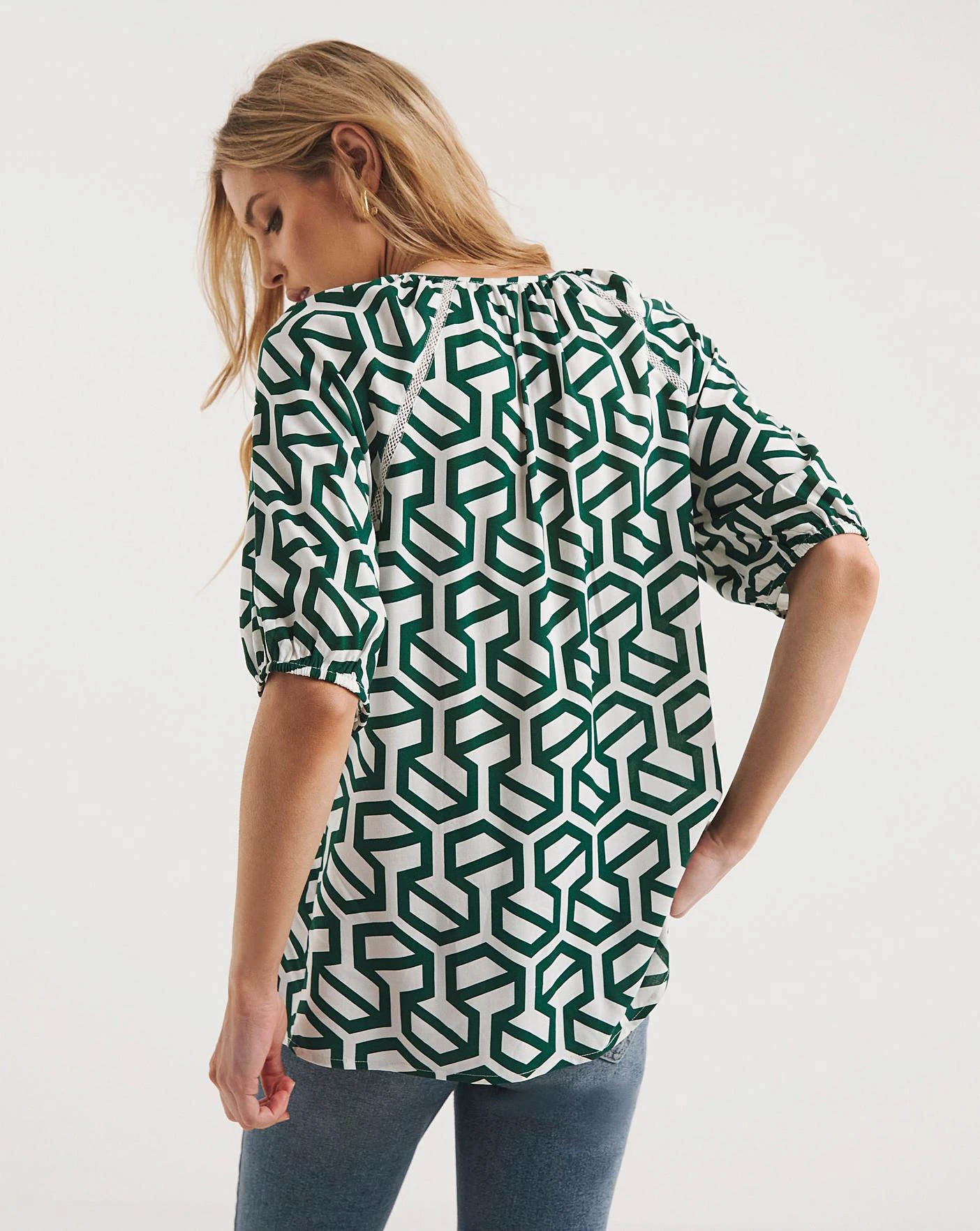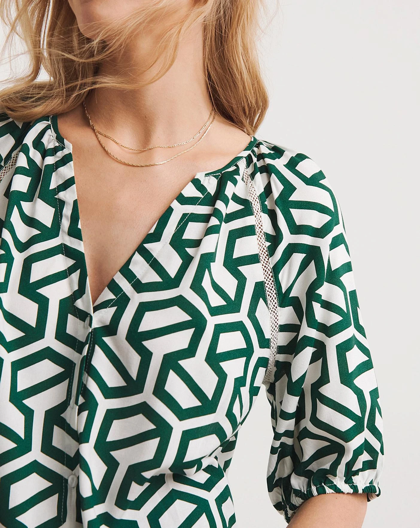 Our lace insert collarless blouse features a flattering print. With puffed sleeves and elasticated cuffs, this blouse can be paired easily with jeans. This is also a great transitional piece and can be layered up with a cosy cardigan. In a relaxed fit, our blouse is made of a non-stretch fabric.