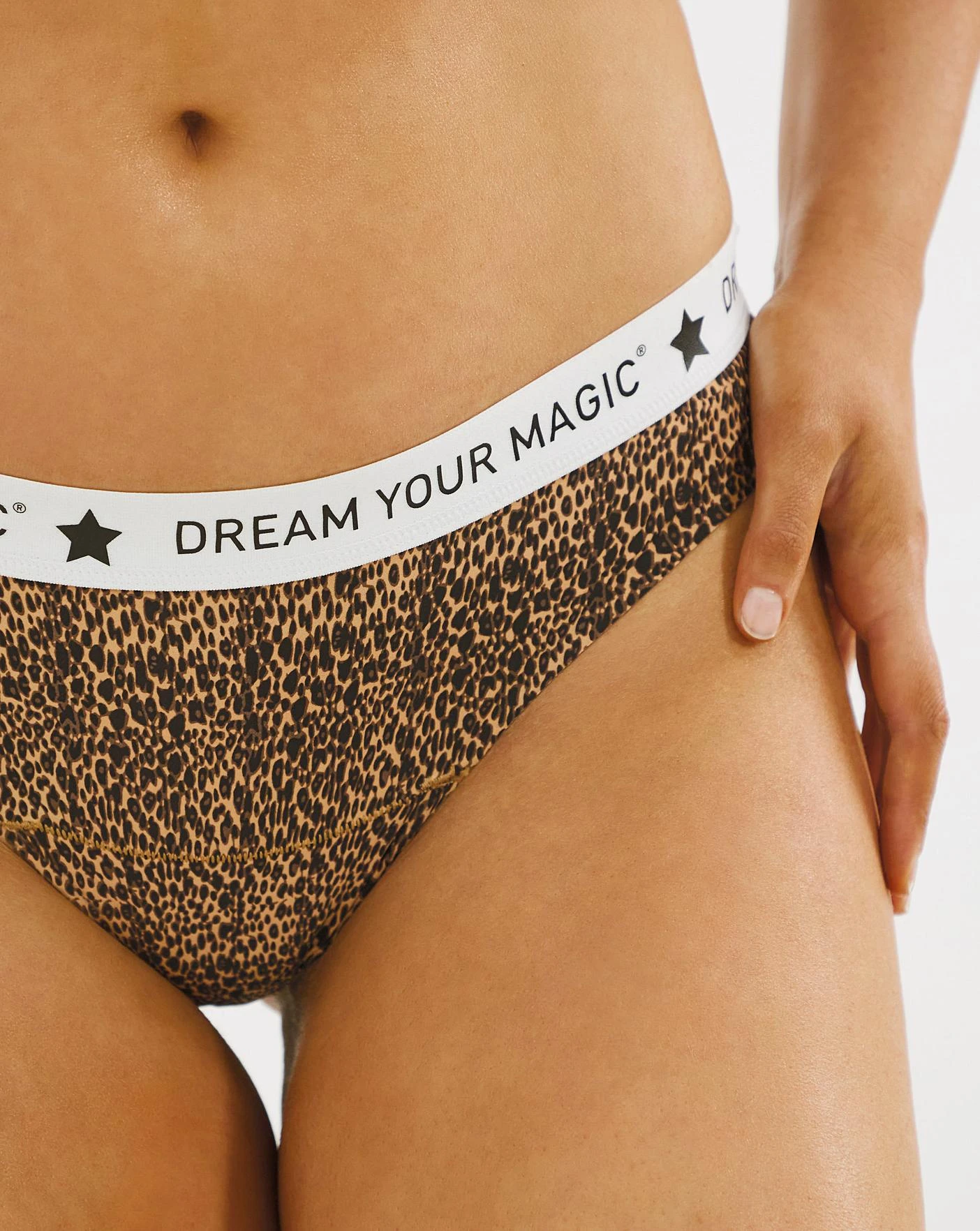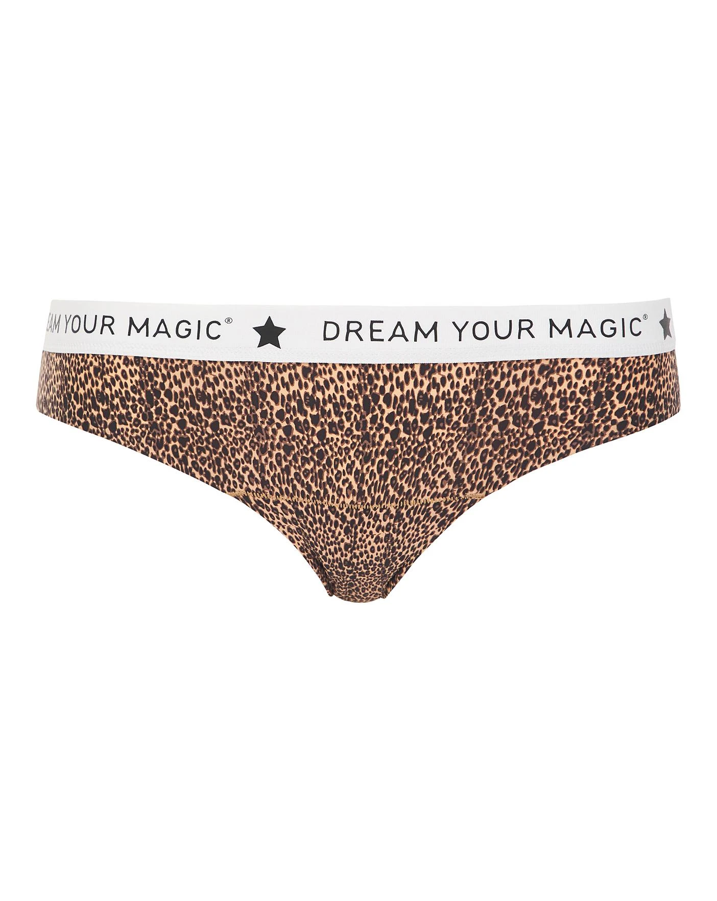 The invisible edges and soft and smooth material makes this Dream Your MAGIC Brief feel like a second skin. The brief has a fashionable Dream Your MAGIC logo banding at the waist, low rise cut and contains a cotton-lined gusset for comfort. Perfect to mix and match with the matching comfort top. Super soft amd smooth leopard print fabric. Smooth finish at the leg opening. Soft elastic logo band.