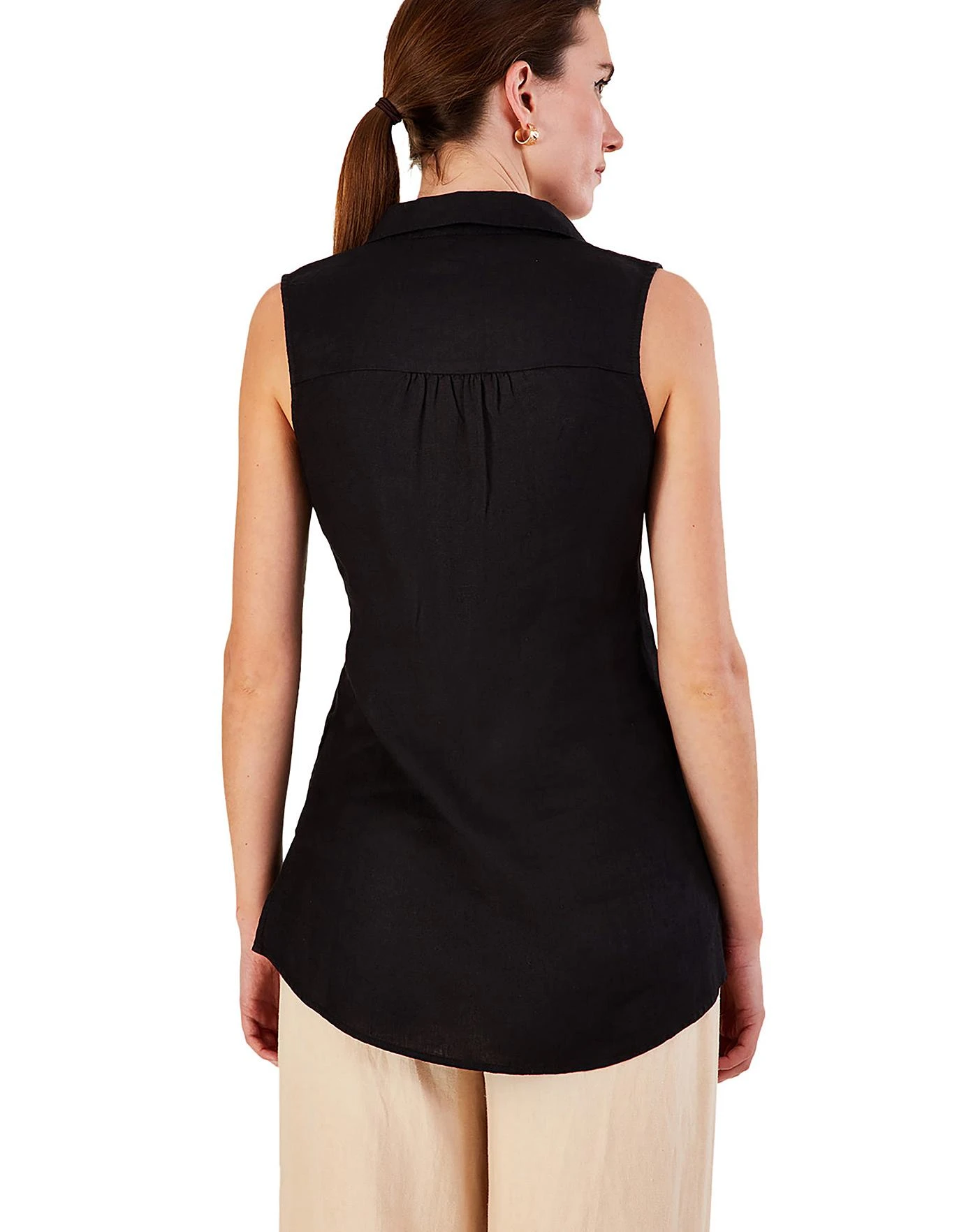 - An easy piece to throw on in the mornings that’s sure to go with your jeans or straight leg trousers. This collared number combines a wear-with-everything backdrop that fills the sleeveless profile, with pleat and button detailing to the front. Spun in light linen.