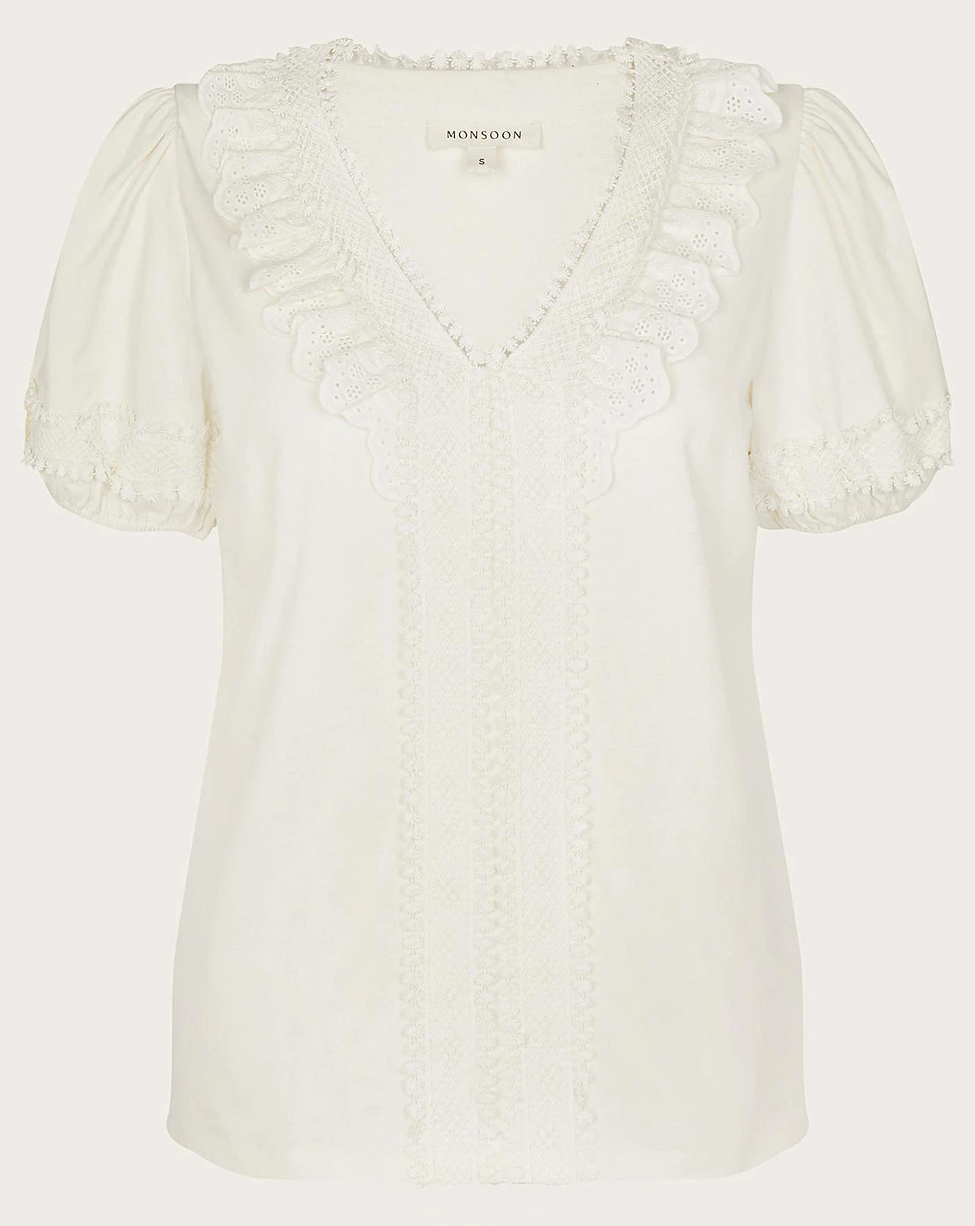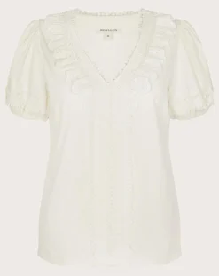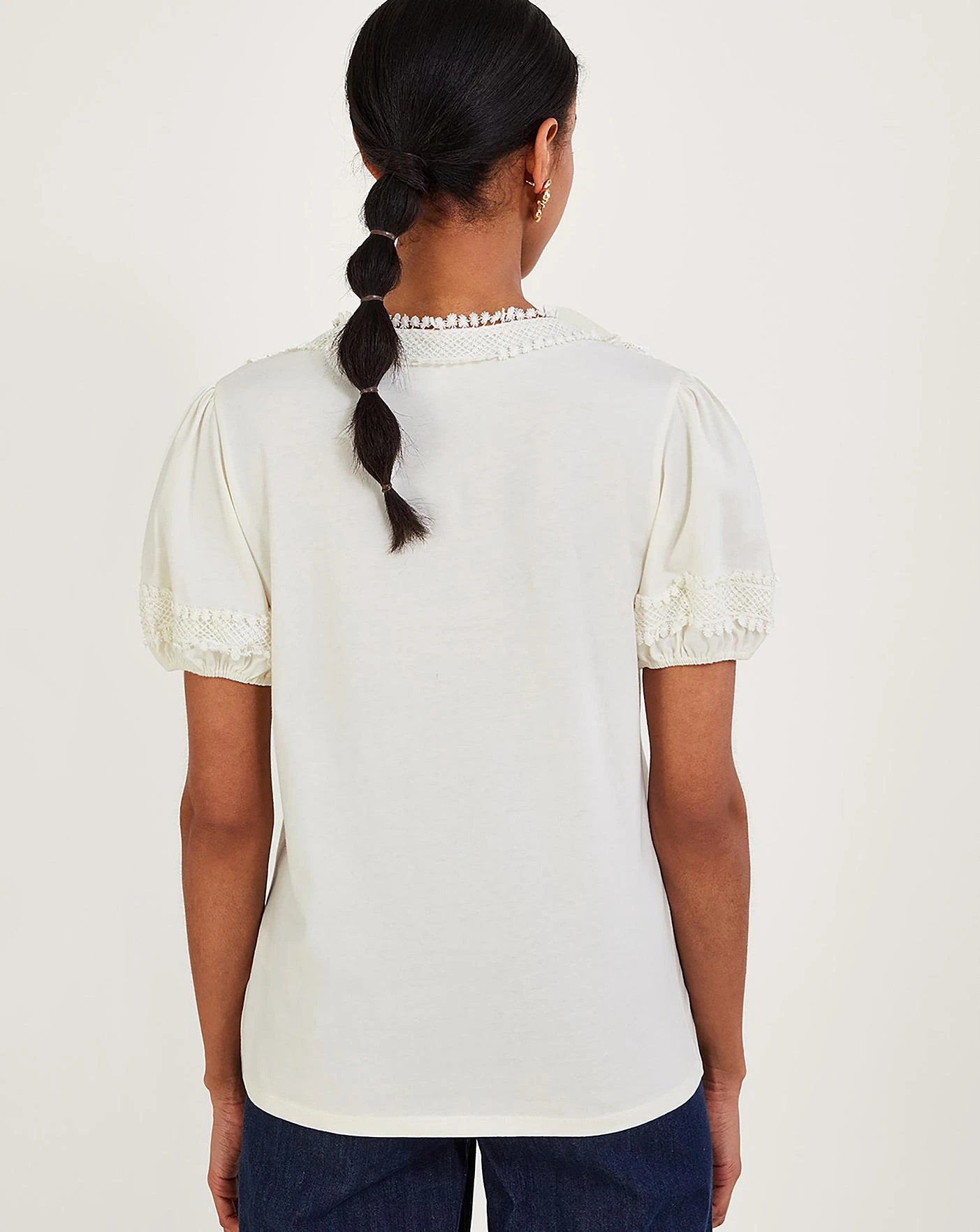 - Dress with comfort for sunny soirees in this casual top. Designed in ivory jersey, we’ve put a hint of bohemia in it through the crochet and lace trims. Finished with a relaxed fit and puff sleeves, style it with linen trousers for that off-duty look. As part of the journey to make our clothes kinder to the world around us, this item was made using more sustainable raw materials, such as organic cotton, recycled polyester and viscose from responsibly grown forests.
