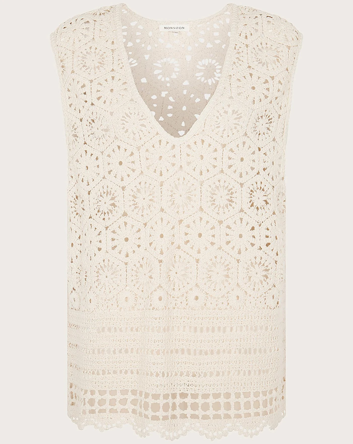- Cover up in crochet with this airy tank top in your summer edit. Ideal to slip over your swimsuit when you run to and from the beach cafe, it boasts a sleeveless fit and loose cut whilst the v-neck provides a space to show off your layered pearl necklace. As part of the journey to make our clothes kinder to the world around us, this item was made using more sustainable raw materials, such as organic cotton, recycled polyester and viscose from responsibly grown forests.