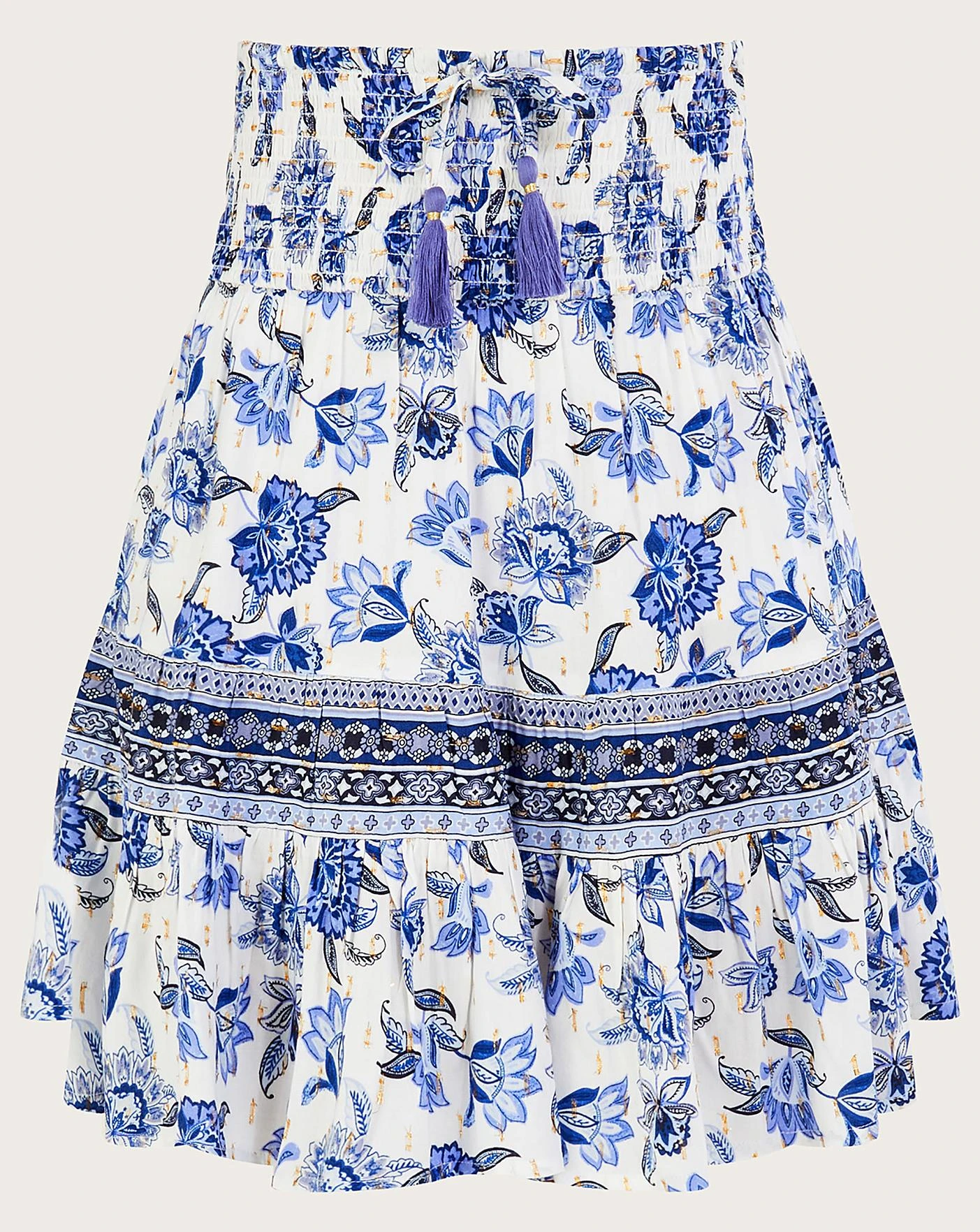 - Fresh, blue florals bloom throughout this short skirt, with a tie detail and shirring over the waistband to perfect the bohemian feel. Finished with a tiered hem and contrast stripes, it’s a piece for holidays and walks at sunset with a maxi cardigan thrown over the top. LENZING ECOVERO is a sustainable fabric derived from certified renewable wood sources and made using eco-responsible production methods. It generates up to 50% lower emissions and water impact than traditional viscose, contributing to a cleaner environment. Just one of our steps towards a future for sustainable fashion, we introduce S.E.W: our commitment to using more eco-conscious materials in our ranges. This capsule collection is created using fabrics that are both kinder to the planet and have a reduced environmental impact. You’ll see blends of organic and better-sourced cotton, viscose from more responsibly grown forests and recycled polyesters made from post-consumer waste.