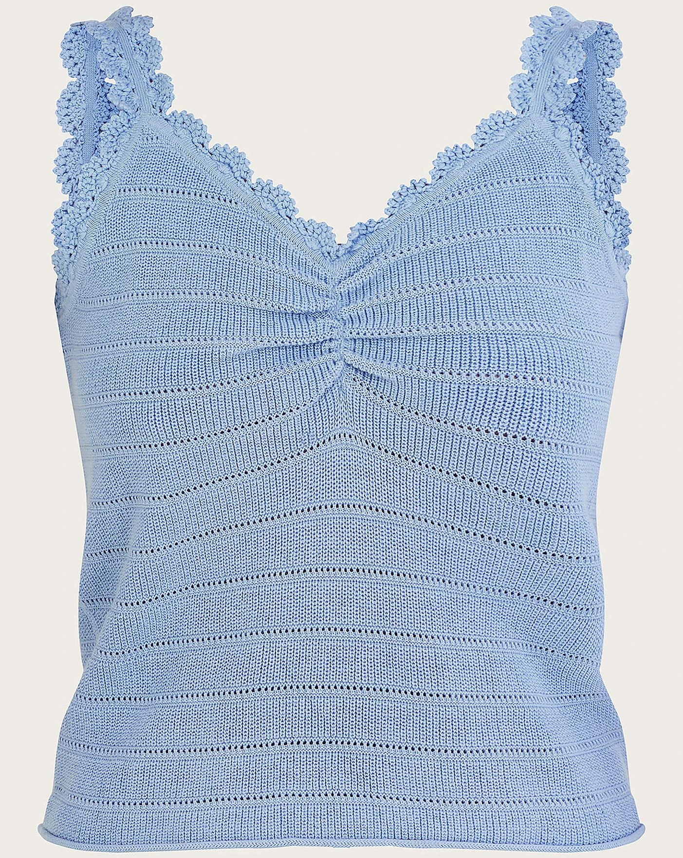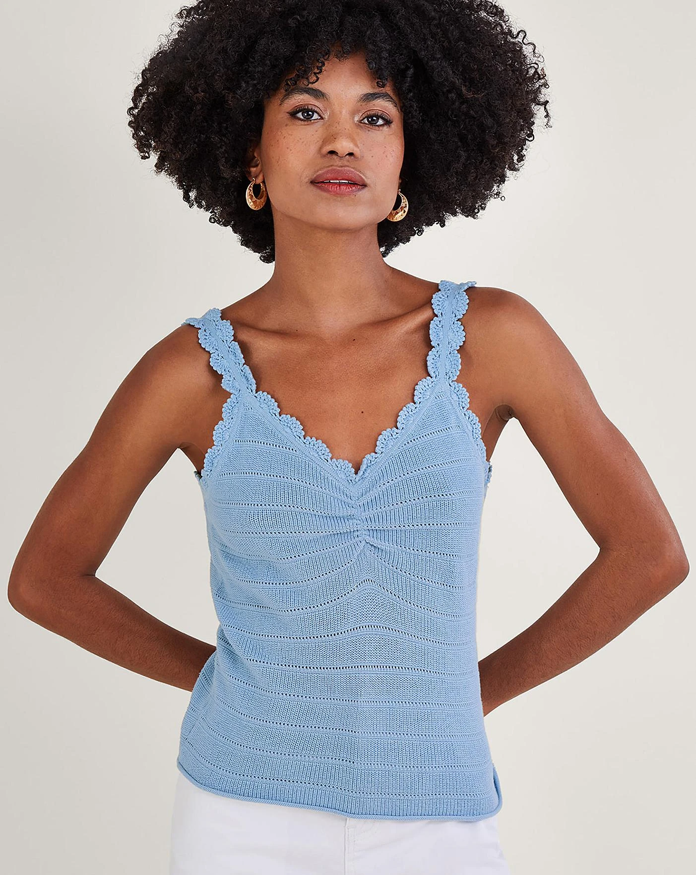 - A simple cami for sunny days, this top is designed with a hand crafted crochet finish. The shoulder straps and neckline boast floral embroidery, with a subtle stripe finish to the bodice. Style it with your best white jeans and ankle boots and take it for a spin on the high street.As part of the journey to make our clothes kinder to the world around us, this item was made using more sustainable raw materials, such as organic cotton, recycled polyester and viscose from responsibly grown forests.