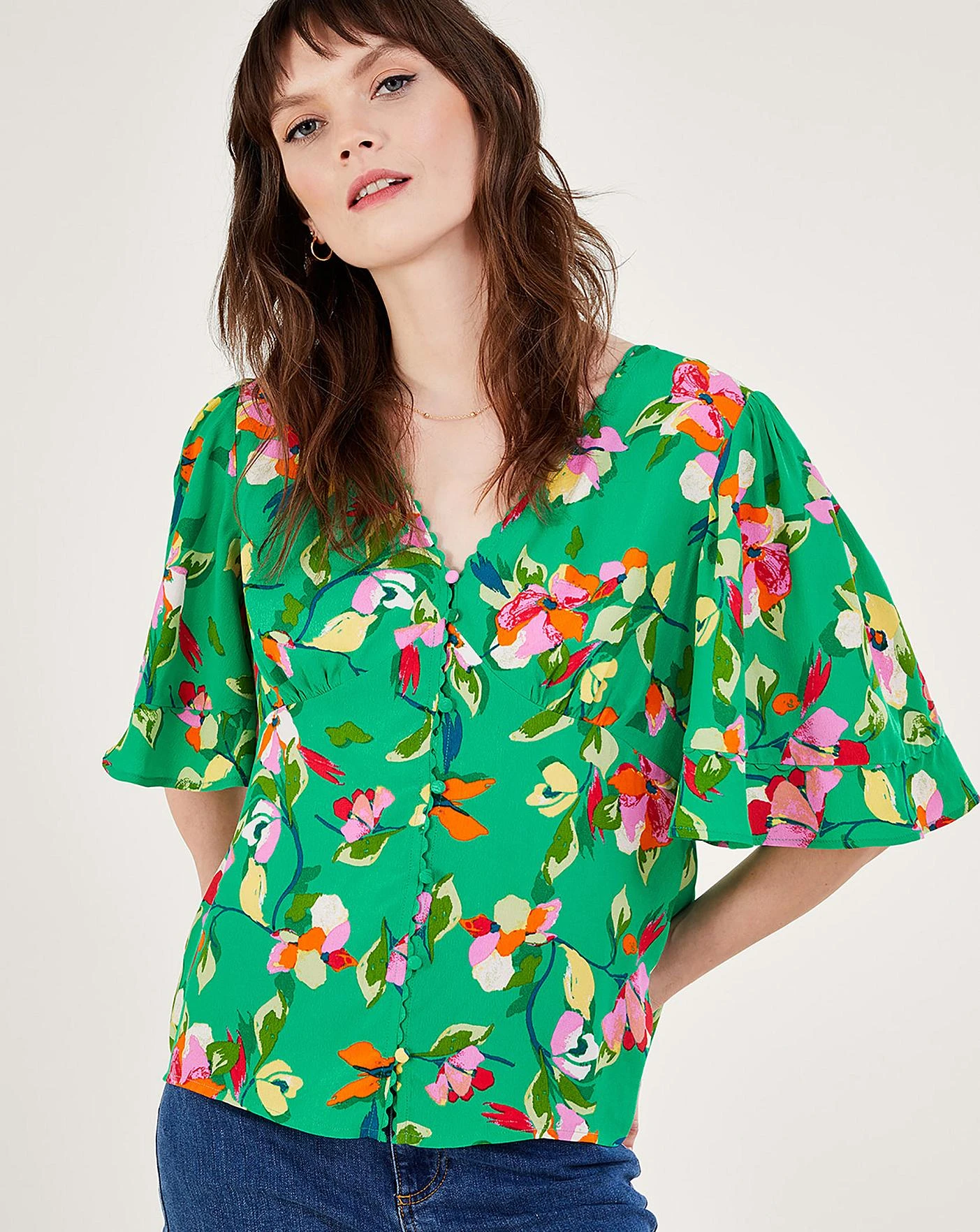 - Douse yourself in florals ready for warm spring and summer days with Lilou. She’s cut in a sweet tea-style silhouette with wide, flowing sleeves and scallop trims for a pretty finish. As part of the journey to make our clothes kinder to the world around us, this item was made using more sustainable raw materials, such as organic cotton, recycled polyester and viscose from responsibly grown forests.