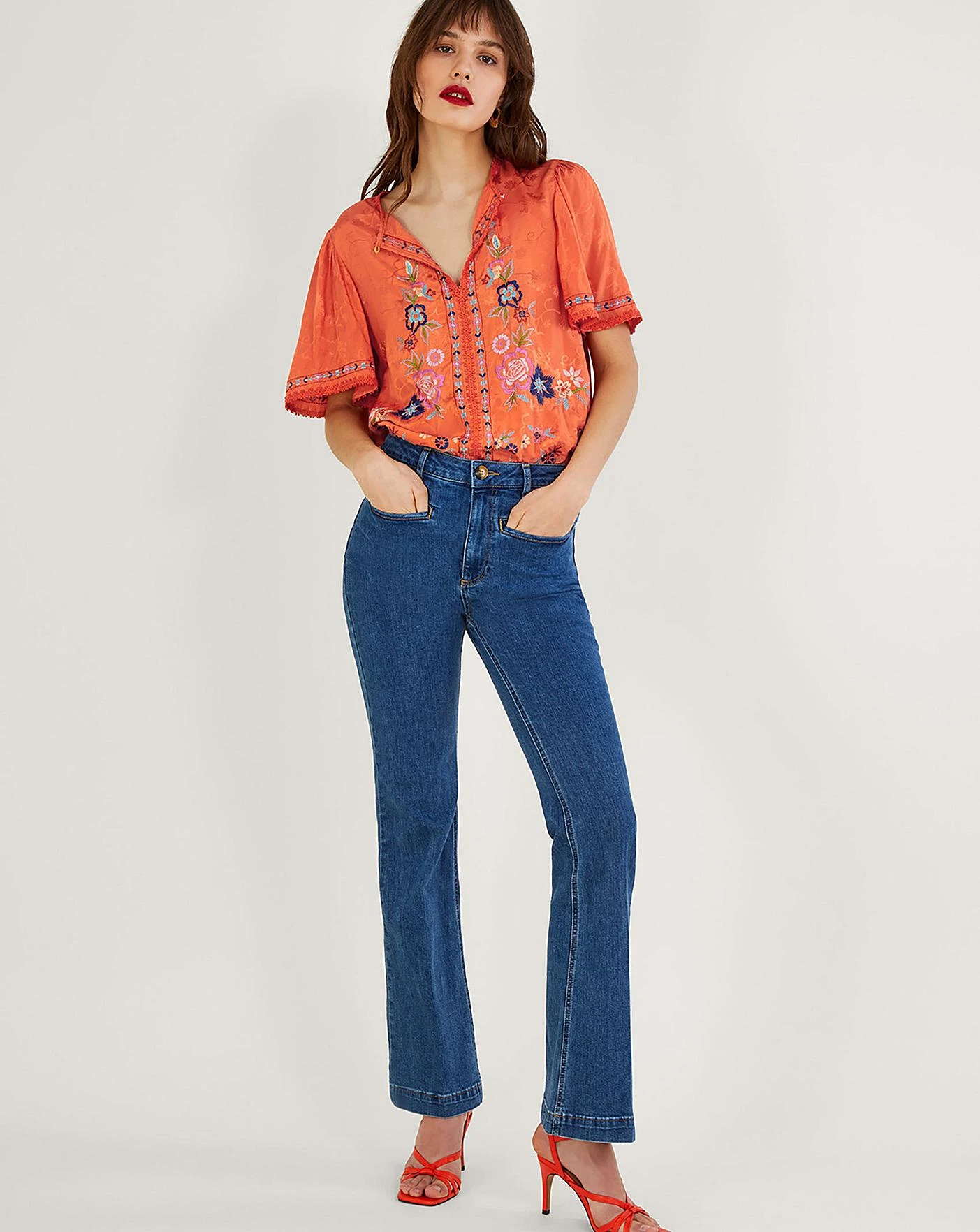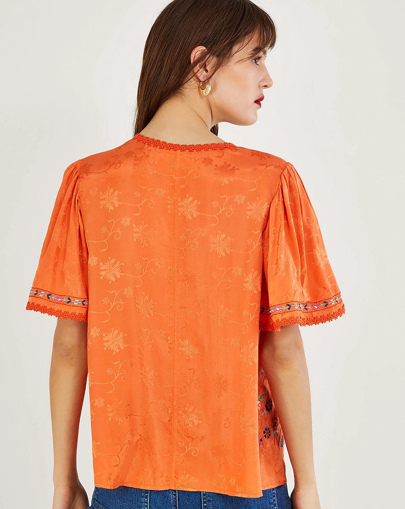 - Matching the warm glow of the summer sunset, Odelia is a truly inviting piece for evenings in the garden with friends. Her tangerine backdrop boasts pretty embroidery to the floaty short sleeves and open neckline, with bright florals embroidered throughout the piece. As part of the journey to make our clothes kinder to the world around us, this item was made using more sustainable raw materials, such as organic cotton, recycled polyester and viscose from responsibly grown forests.
