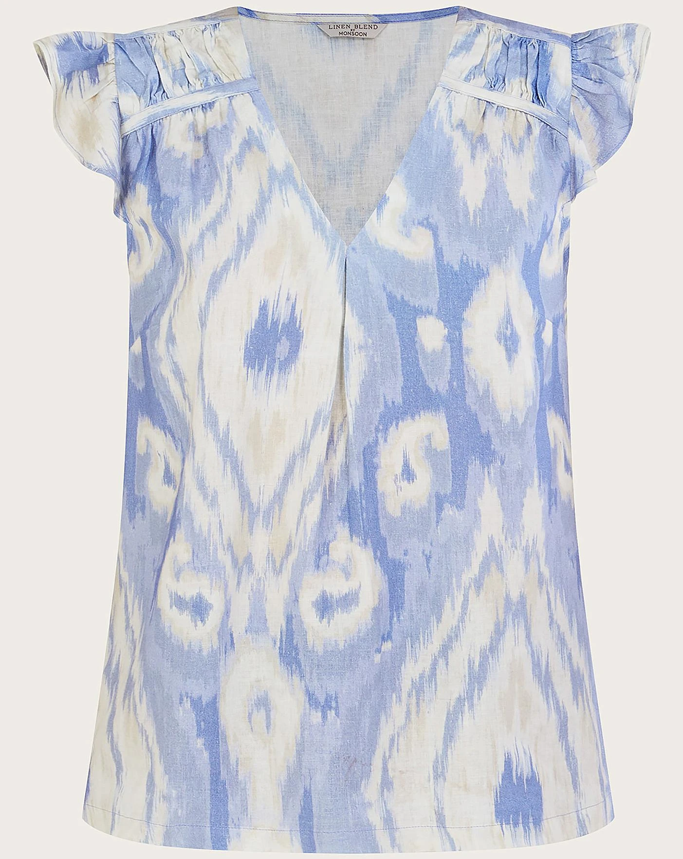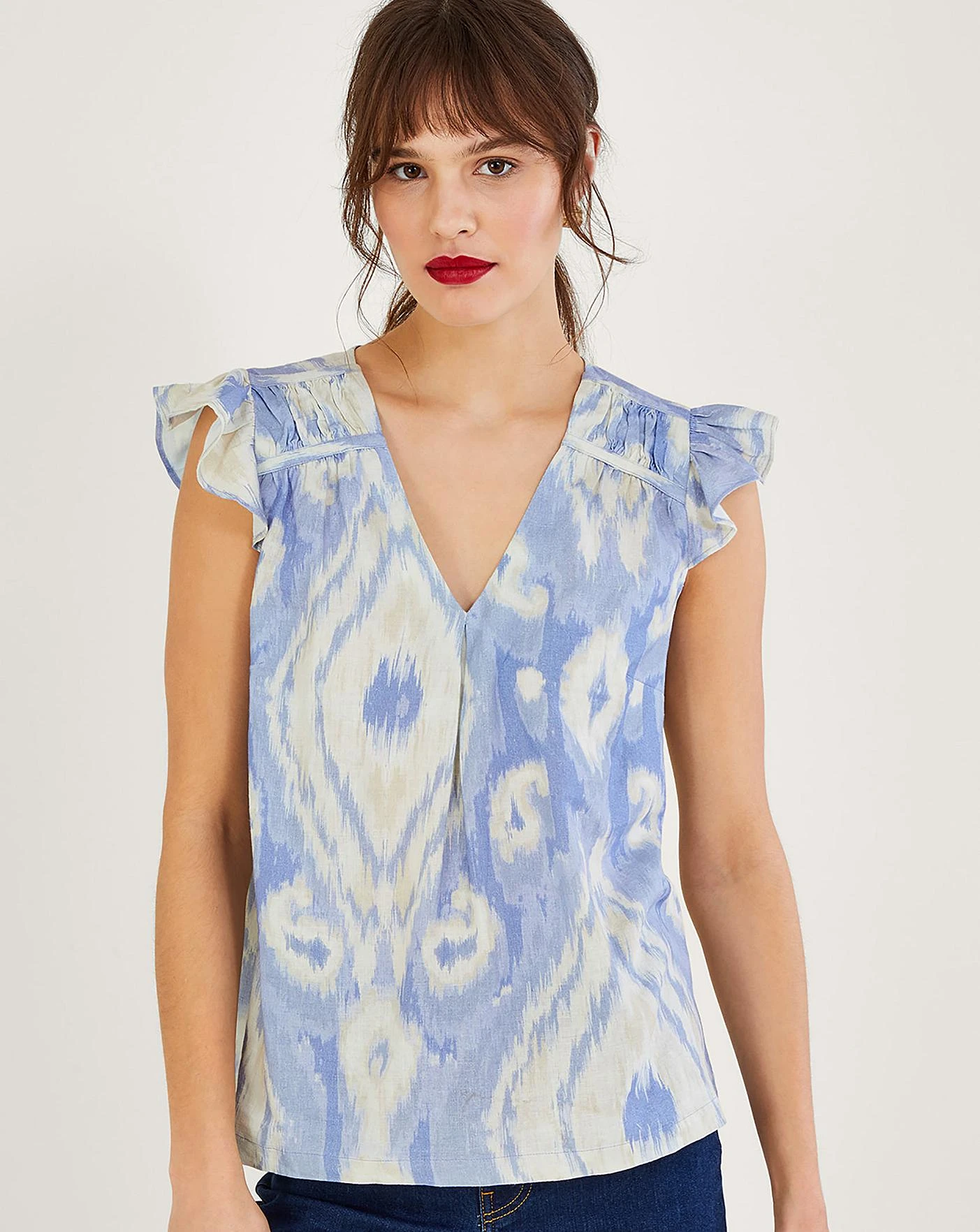 - It’s lightweight, it’s comfortable, it’s our Peggy tank top.Designed with summertime in mind, Peggy features a bohemian-style ikat print, with pretty ruffle sleeves and a v-neck to finish. Spun in a linen blend for optimum breeziness. As part of the journey to make our clothes kinder to the world around us, this item was made using more sustainable raw materials, such as organic cotton, recycled polyester and viscose from responsibly grown forests.