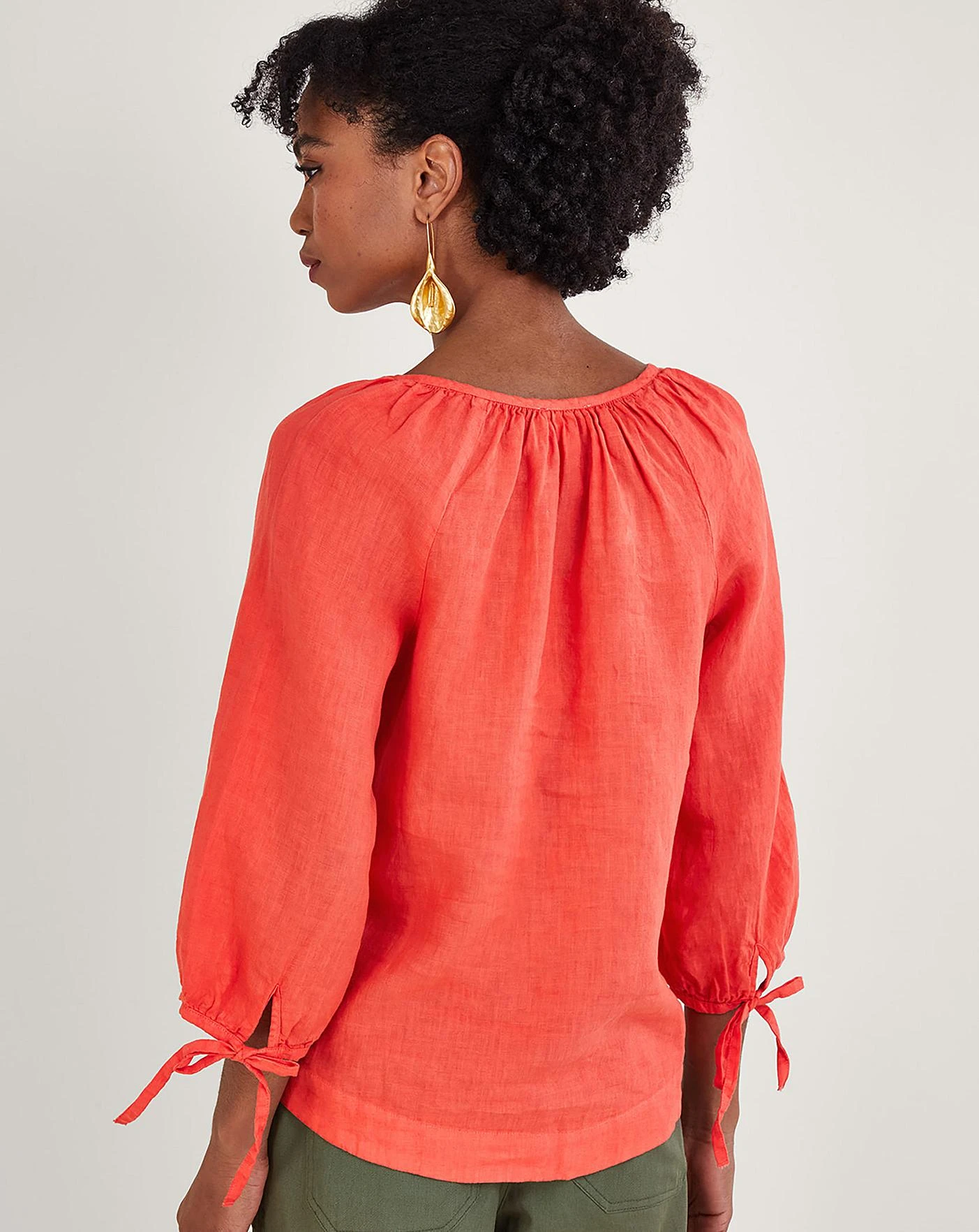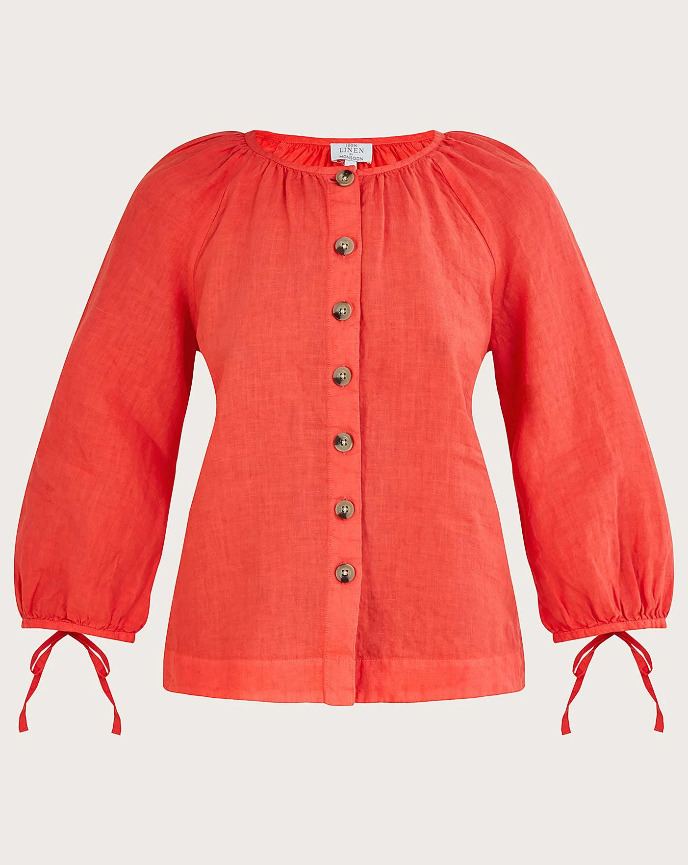 - Cool and contemporary, this linen blouse goes with just about everything! Designed in a relaxed fit, it features puff blouson sleeves that tie at the cuffs and a round neck. Finished with a button through front, style it with cargo trousers and fresh white plimsols for that off-duty look.