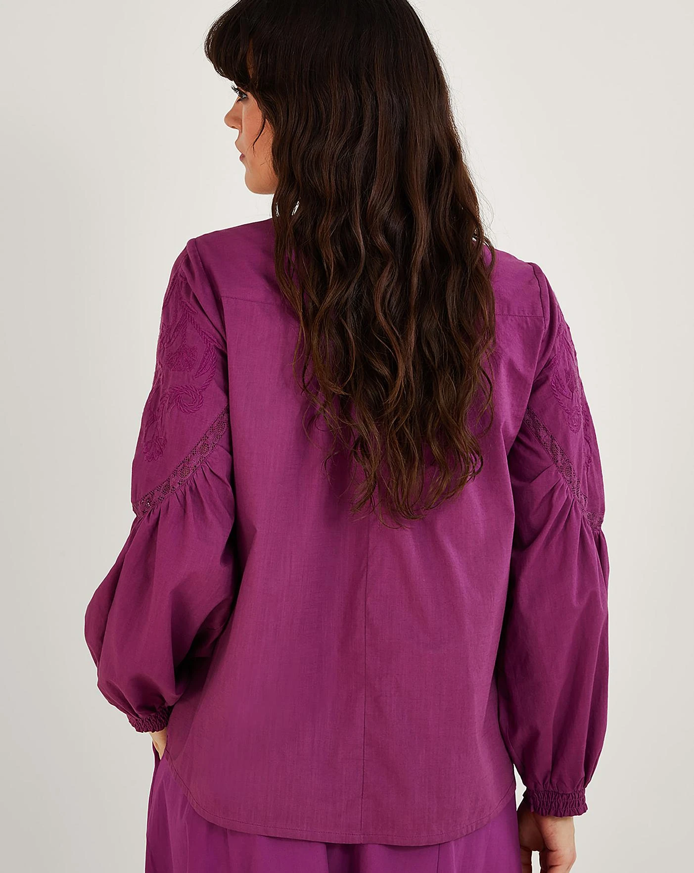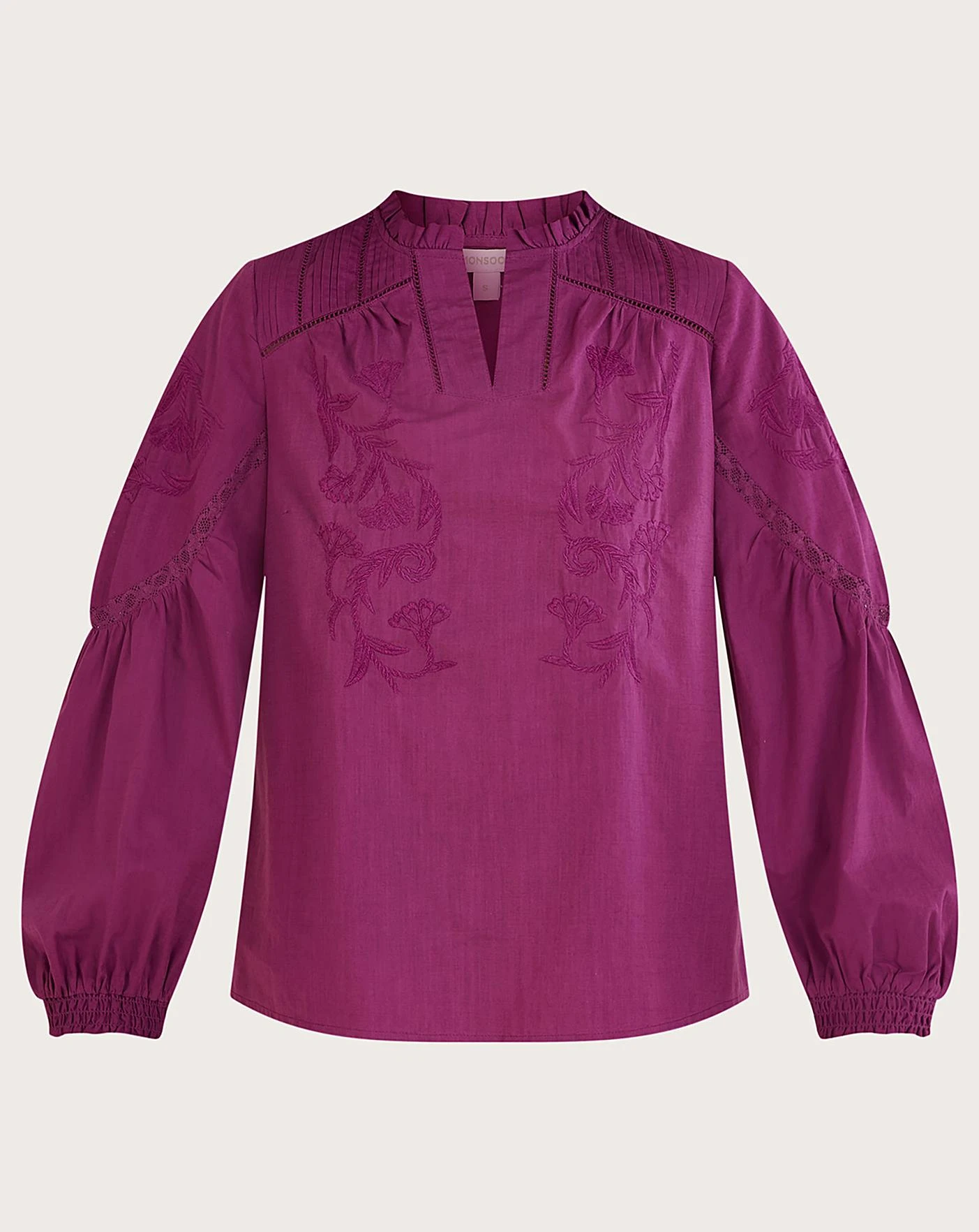 - Cast in a tonal plum hue, this top is cut in a relaxed, overhead silhouette. The open neckline and blousal sleeves adds a contemporary touch to the piece, designed with matching floral embroidery for a feminine finish. As part of the journey to make our clothes kinder to the world around us, this item was made using more sustainable raw materials, such as organic cotton, recycled polyester and viscose from responsibly grown forests.